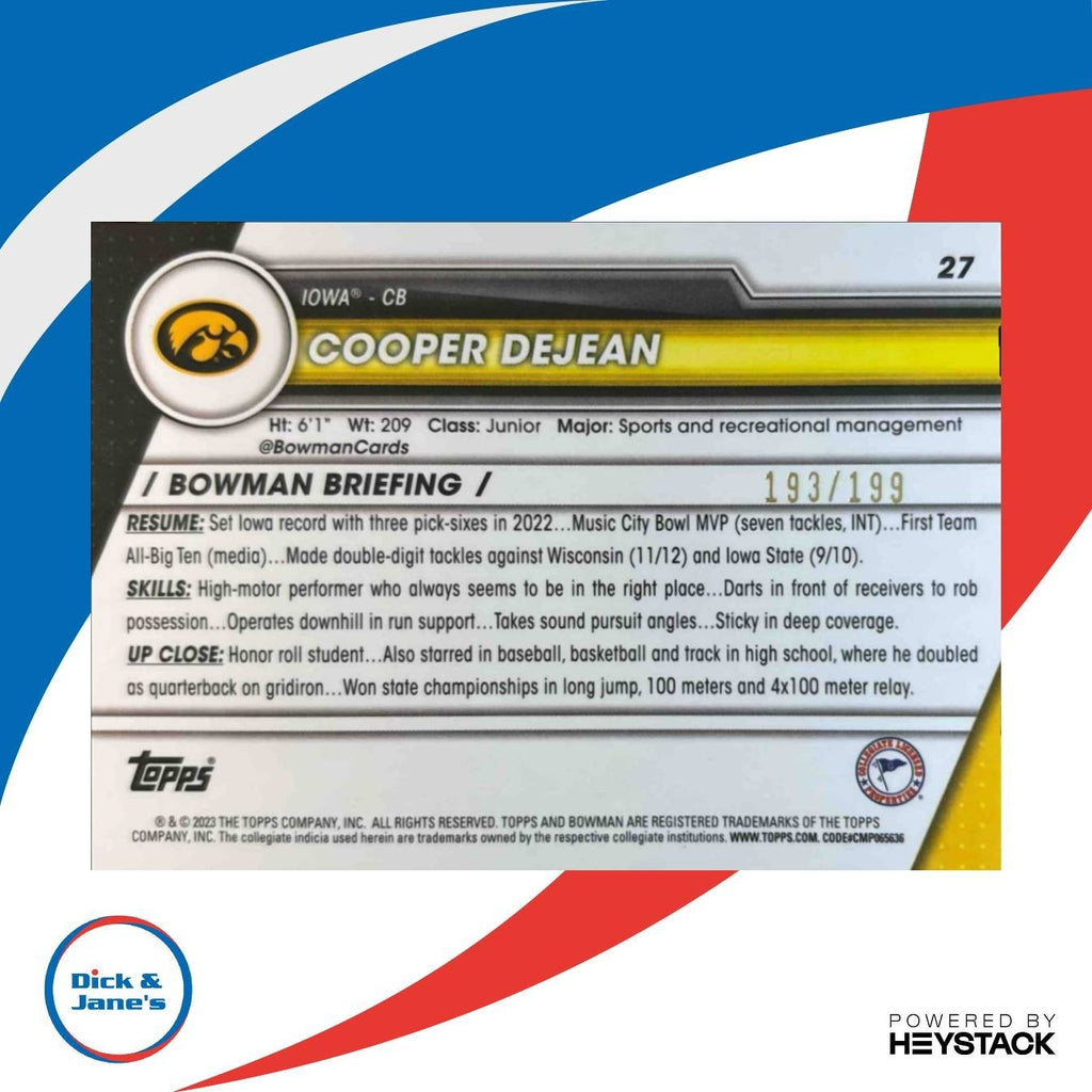 Rare 2023 NCAAF trading card featuring Cooper Dejean of the Hawkeyes. Limited edition blue refractor edition numbered 193/199. Perfect for any serious collector or Iowa fan. Don't miss out on adding this special card to your collection! Listed With Mascot.