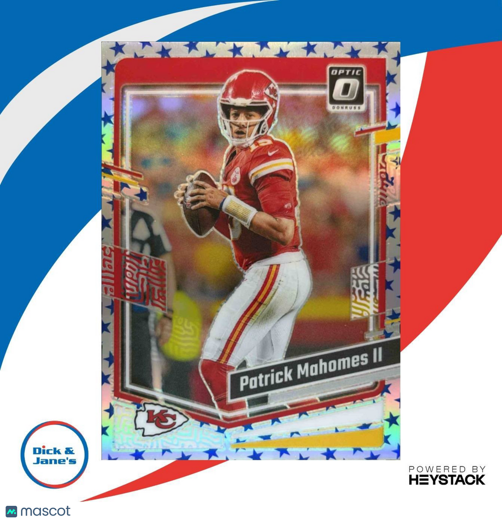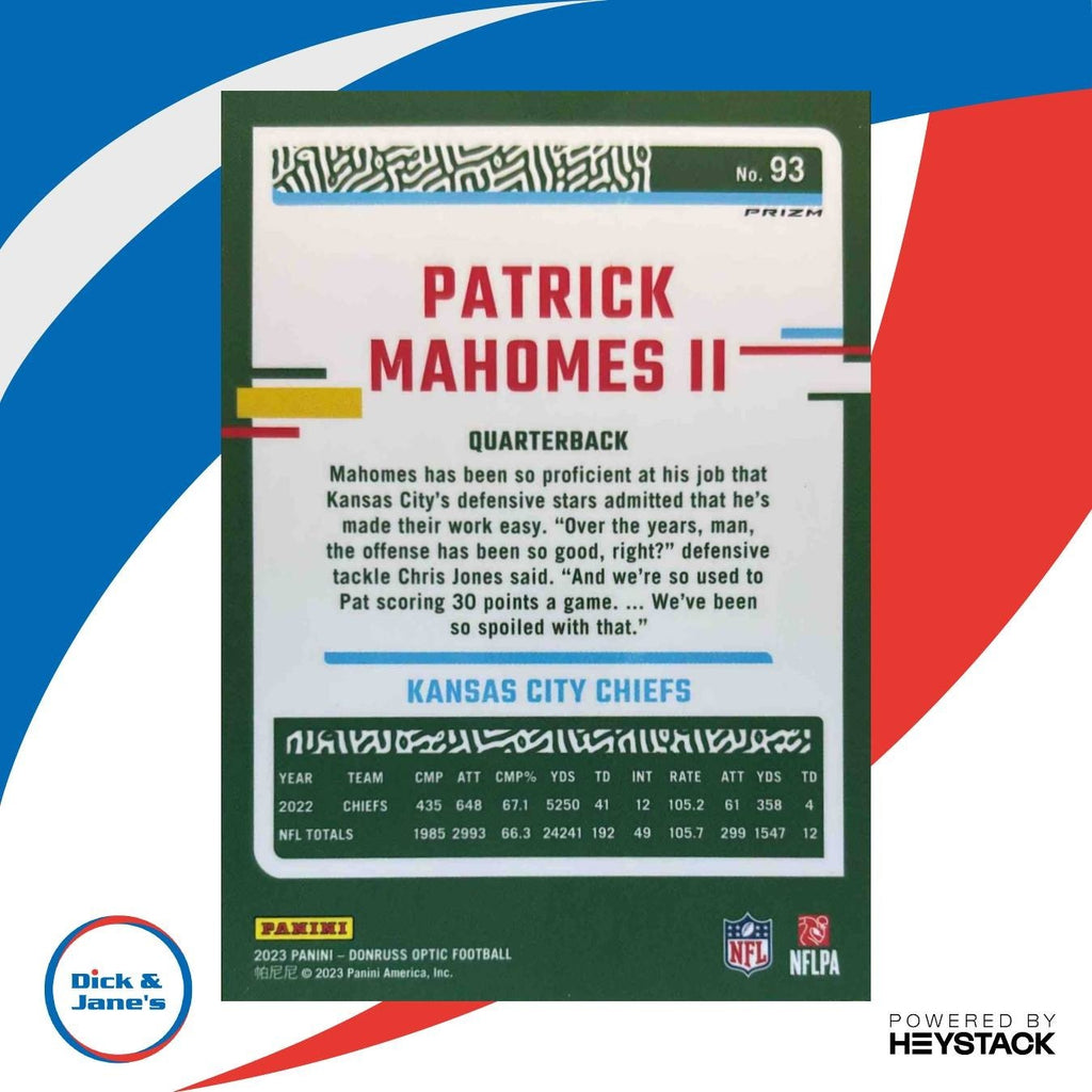 The 2023 Donruss Optic Patrick Mahomes II Blue Stars Prizm #93 trading card features the star quarterback of the Kansas City Chiefs in a striking blue stars design. A must-have for football fans, this card showcases Mahomes in all his glory. Don't miss out on adding this rare and collectible card to your sports memorabilia collection. Listed With Mascot.