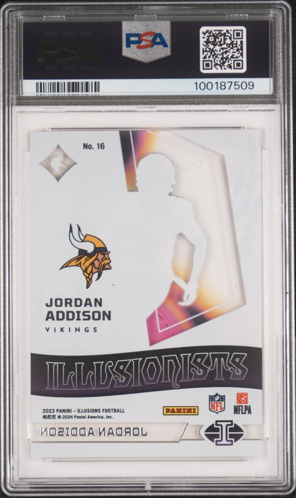 2023 Illusions Illusionists Jordan Addison #16 PSA 10 GEM MINT Minnesota Vikings Don’t miss your chance to own this stunning 2023 Panini Illusions Illusionists Jordan Addison #16, graded a perfect PSA 10 GEM MINT! With only 14 of these cards in existence and none graded higher, this is a must-have for serious collectors and Minnesota Vikings fans. Jordan Addison’s rookie cards are quickly becoming hot commodities, and this rare gem is sure to stand out in any football card collection. Authenticated by Professional Sports Authenticator (PSA) with certification number 100187509, this card offers both top-tier quality and investment potential. Whether you’re a dedicated Vikings supporter or a savvy collector looking for the best, this card is ready to elevate your collection—act fast before it’s gone! Graded: Yes Sport: Football Population Higher: 0 Set: 2023 Panini Illusions Illusionists Certification Number: 100187509 Grader: Professional Sports Authenticator (PSA) Manufacturer: Panini Population: 14 Grade: 10 Year Manufactured: 2023 Player/Athlete: Jordan Addison Team: Minnesota Vikings Card Number: 16 Listed With Mascot.