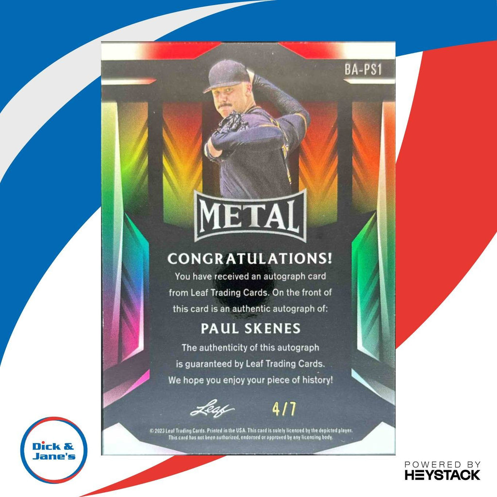 2023 Leaf Metal Paul Skenes Auto Purple Wave /7 BA-PS1 Pittsburgh Pirates Rookie Listed With Mascot.