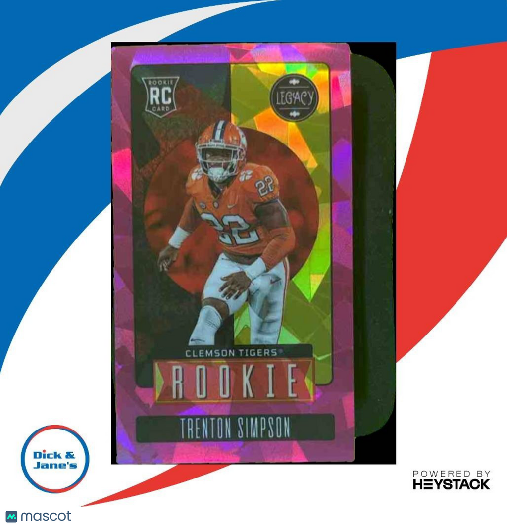 The 2023 Legacy Trenton Simpson Premium Edition Diamond Mini card is a must-have for any NCAAF collector. This rare rookie card is numbered 5/5 and features Simpson in his Tigers uniform. Add this special edition card to your collection today! Listed With Mascot.