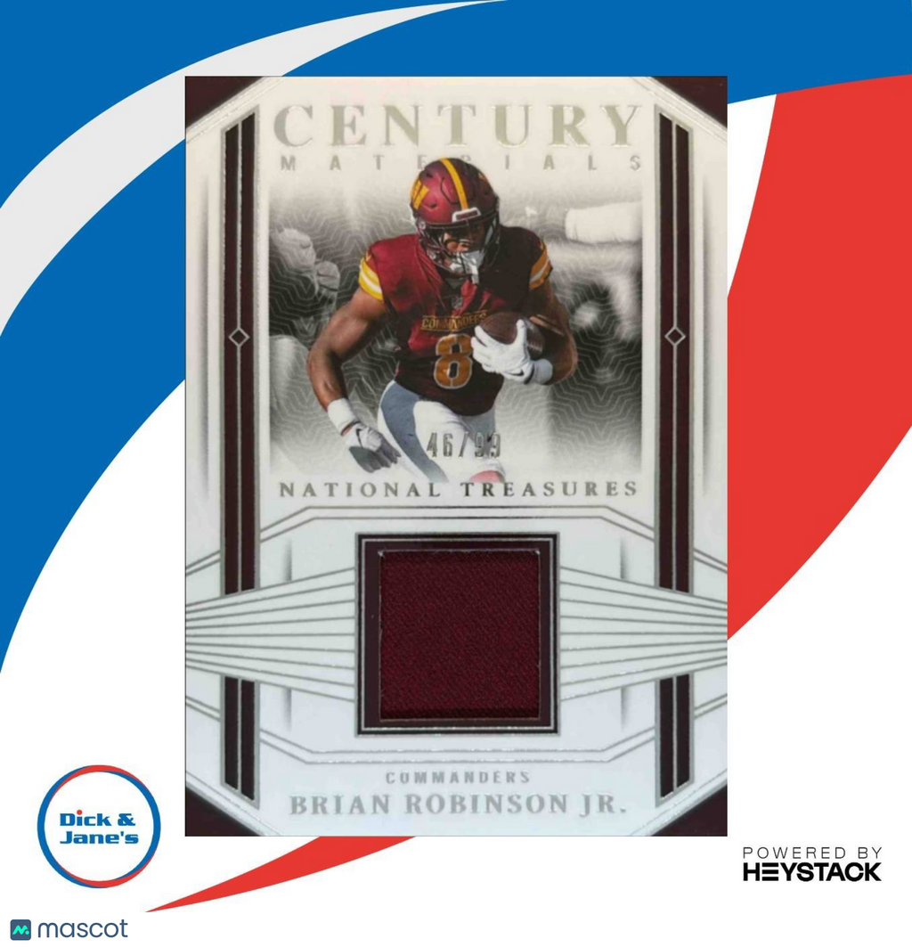 This 2023 National Treasures Brian Robinson Jr. Century Materials 46/99 Commanders trading card is a rare find for any NFL fan. Featuring a piece of game-worn jersey from the player, this limited edition card is a must-have for collectors. Don't miss your chance to own a piece of sports history. Listed With Mascot.
