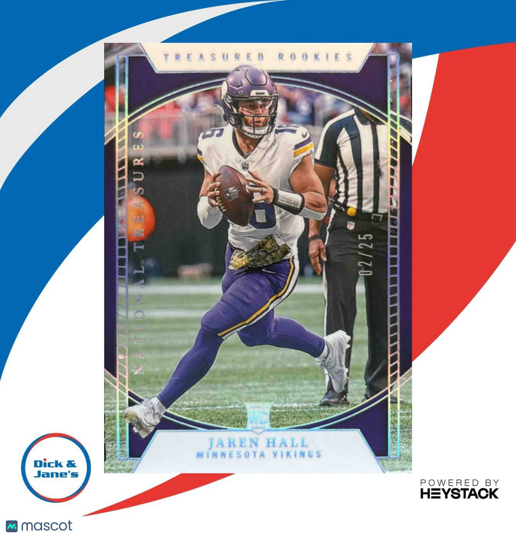 Own a piece of football history with the 2023 National Treasures Jaren Hall Treasured Rookies Holo Silver card. Limited to only 25 copies, this card features the promising rookie from the Vikings. Don't miss your chance to add this rare collectible to your trading card collection. Listed With Mascot.