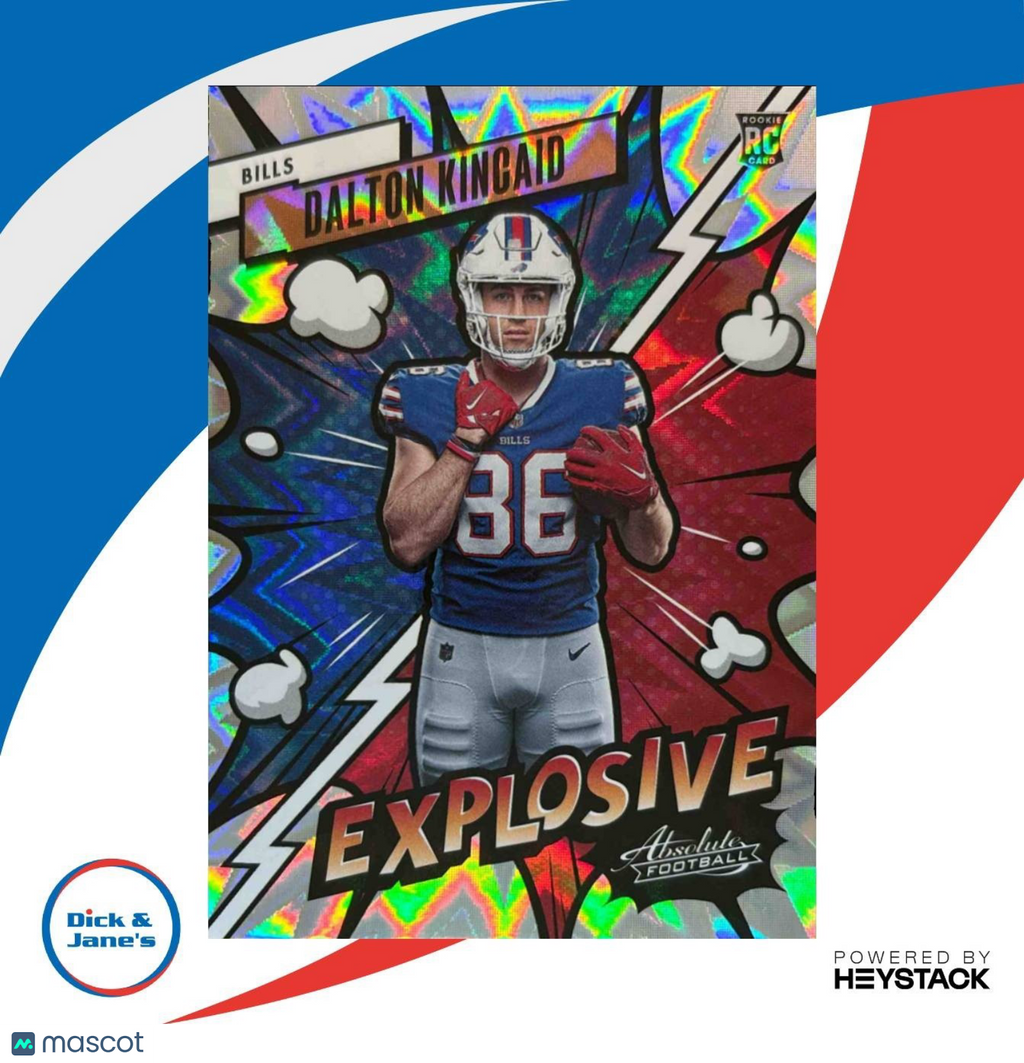 The 2023 Panini Absolute Dalton Kincaid Explosive #45 RC Buffalo Bills trading card is a must-have for any NFL fan. Featuring a rookie card of the explosive Buffalo Bills player, this rare and collectible item is sure to be a prized addition to any sports memorabilia collection. Don't miss your chance to own a piece of football history! Listed With Mascot.