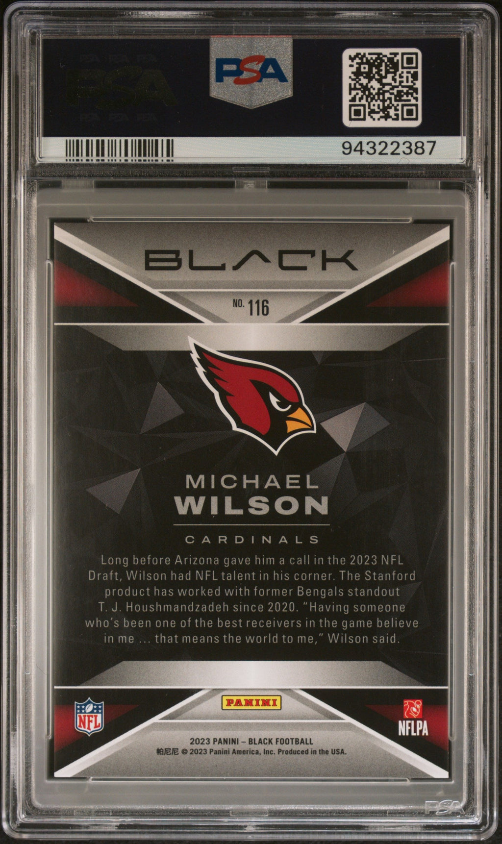You are purchasing the following: 2023 Panini Black Michael Wilson Citrine 07/25 #116 PSA 9 Arizona Cardinals. You will receive the exact item in the photographs. Note: Please do not connact us and asking the following: 1. What is the lowest you would take? Just make an offer. If the offer is automatically declined, you have your answer. 2. What the best you can do? See above. Not repling to an email is a reply. 3. Any room on this? See above. Not repling to an offer is a reply. 4. We ONLY do one counter offer, so please make your best offer the first time! Note: If the price off, in your option, please send your resaoning and an offer. We will review it. Note: We manage nearly 10 millon cards regularly and will adjust prices as errors are noticed or pointed out! Listed With Mascot.