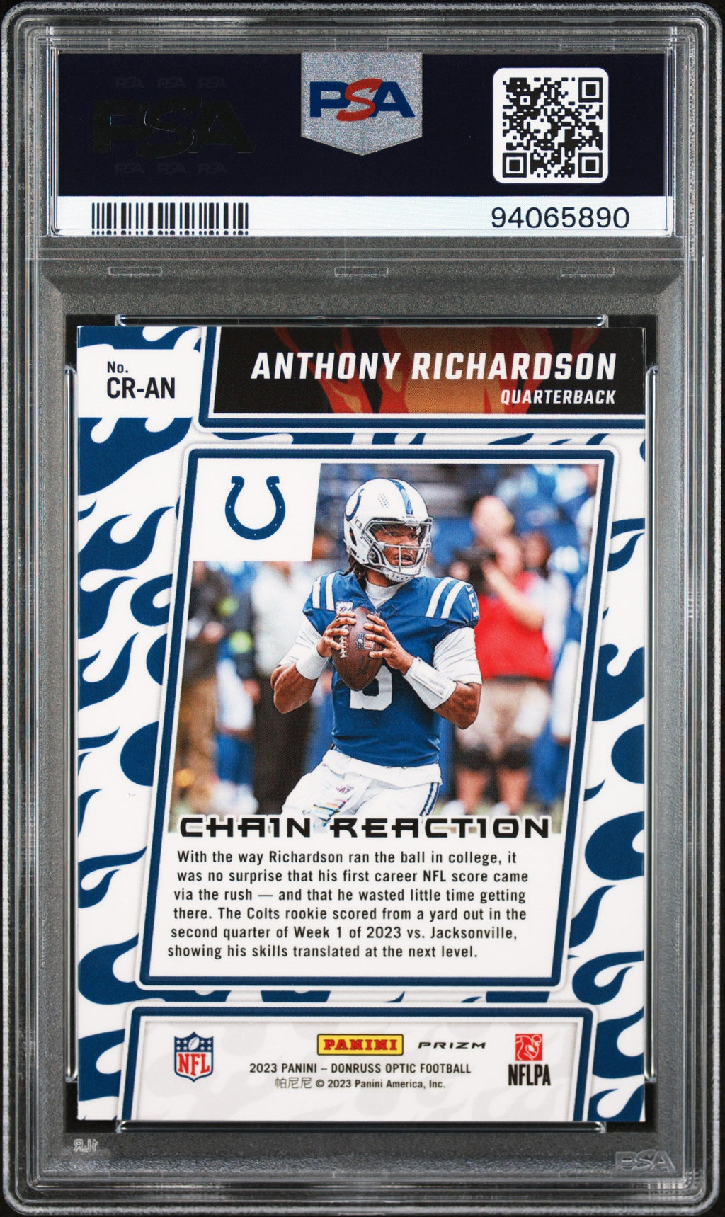 You are purchasing the following: 2023 Panini Donruss Optic Chain Reaction Anthony Richardson #CRAN PSA 10 Indianapolis Colts. You will receive the exact item in the photographs. Note: Please do not connact us and asking the following: 1. What is the lowest you would take? Just make an offer. If the offer is automatically declined, you have your answer. 2. What the best you can do? See above. Not repling to an email is a reply. 3. Any room on this? See above. Not repling to an offer is a reply. 4. We ONLY do one counter offer, so please make your best offer the first time! Note: If the price off, in your option, please send your resaoning and an offer. We will review it. Note: We manage nearly 10 millon cards regularly and will adjust prices as errors are noticed or pointed out! Listed With Mascot.