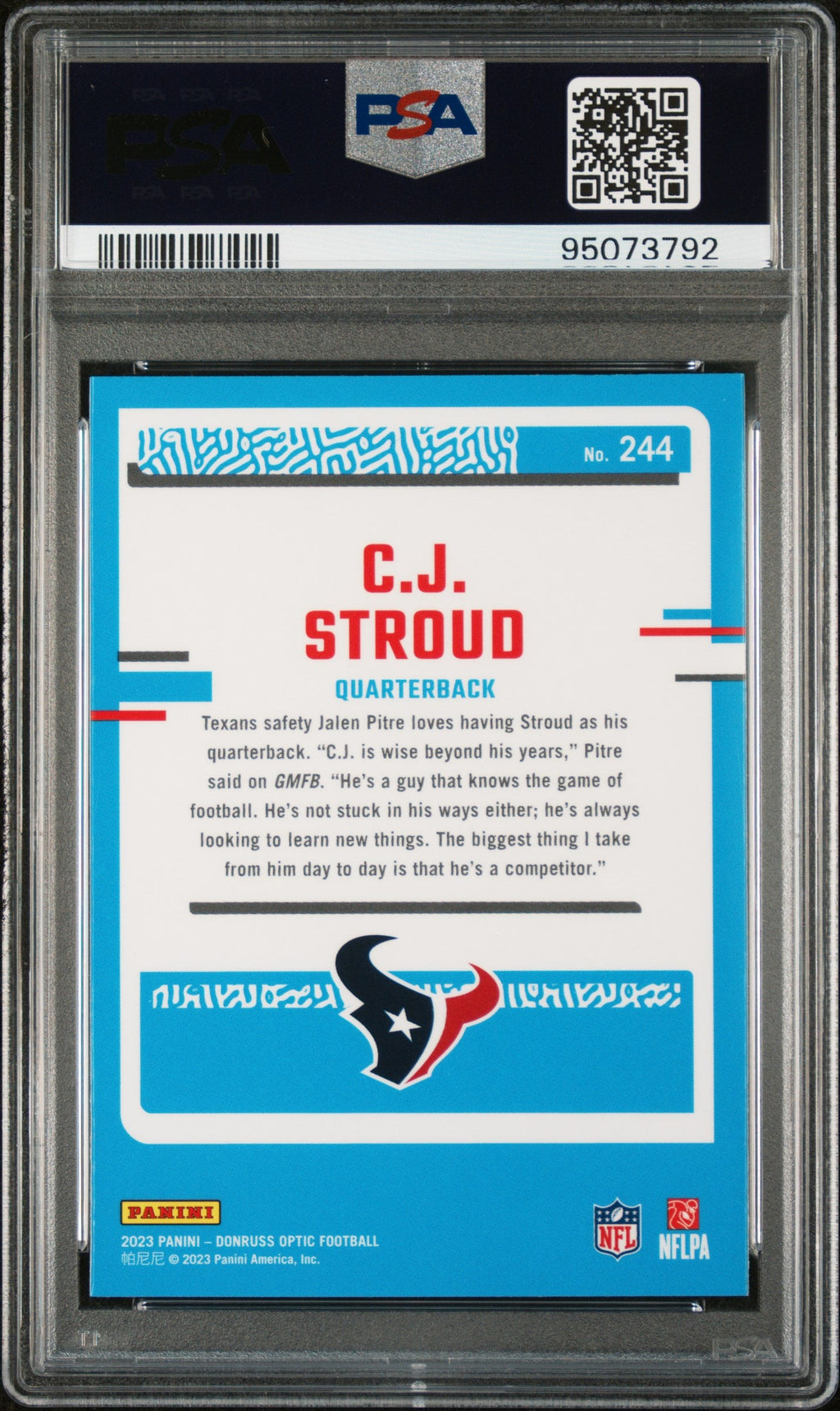 You are purchasing the following: 2023 Panini Donruss Optic CJ Stroud #244 PSA 10 . You will receive the exact item in the photographs. Note: Please do not connact us and asking the following: 1. What is the lowest you would take? Just make an offer. If the offer is automatically declined, you have your answer. 2. What the best you can do? See above. Not repling to an email is a reply. 3. Any room on this? See above. Not repling to an offer is a reply. 4. We ONLY do one counter offer, so please make your best offer the first time! Note: If the price off, in your option, please send your resaoning and an offer. We will review it. Note: We manage nearly 10 millon cards regularly and will adjust prices as errors are noticed or pointed out! Listed With Mascot.