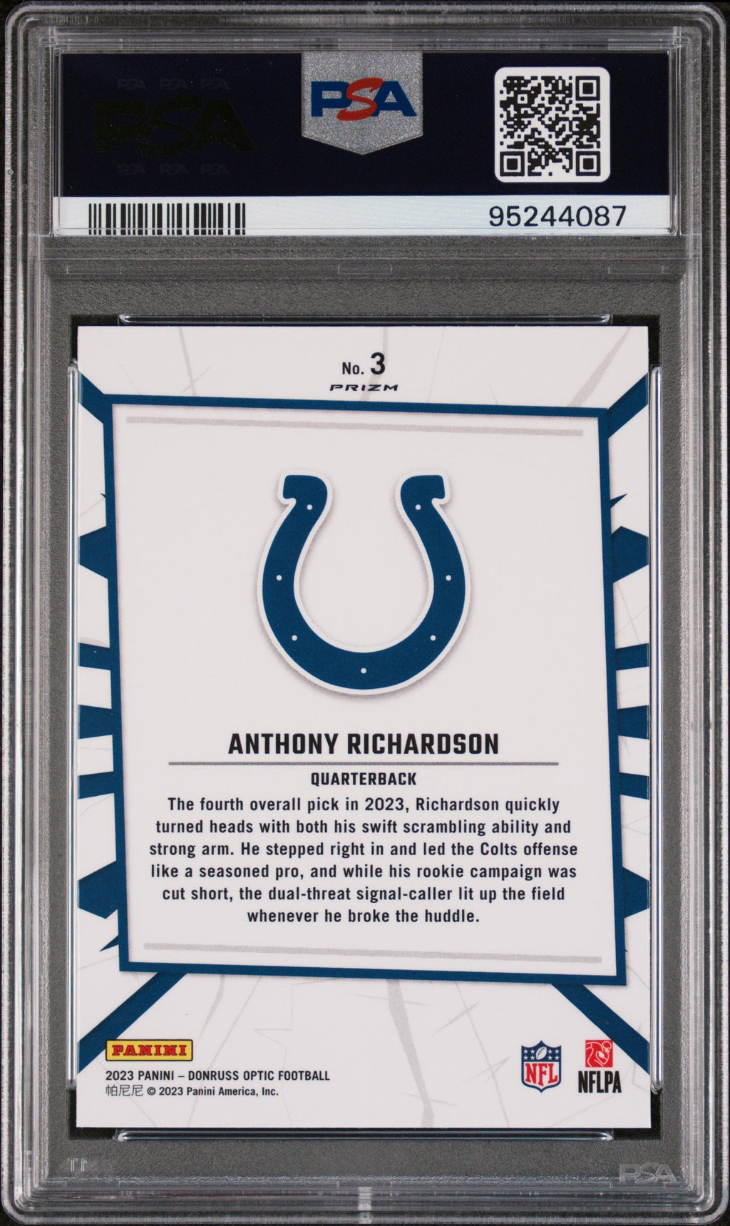 You are purchasing the following: 2023 Panini Donruss Optic My House! Anthony Richardson #3 PSA 10 . You will receive the exact item in the photographs. Note: Please do not connact us and asking the following: 1. What is the lowest you would take? Just make an offer. If the offer is automatically declined, you have your answer. 2. What the best you can do? See above. Not repling to an email is a reply. 3. Any room on this? See above. Not repling to an offer is a reply. 4. We ONLY do one counter offer, so please make your best offer the first time! Note: If the price off, in your option, please send your resaoning and an offer. We will review it. Note: We manage nearly 10 millon cards regularly and will adjust prices as errors are noticed or pointed out! Listed With Mascot.