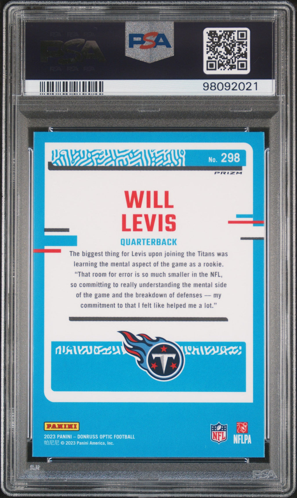 You are purchasing the following: 2023 Panini Donruss Optic Will Levis Holo Rookie #298 PSA 9 Tennessee Titans. You will receive the exact item in the photographs. Note: Please do not connact us and asking the following: 1. What is the lowest you would take? Just make an offer. If the offer is automatically declined, you have your answer. 2. What the best you can do? See above. Not repling to an email is a reply. 3. Any room on this? See above. Not repling to an offer is a reply. 4. We ONLY do one counter offer, so please make your best offer the first time! Note: If the price off, in your option, please send your resaoning and an offer. We will review it. Note: We manage nearly 10 millon cards regularly and will adjust prices as errors are noticed or pointed out! Listed With Mascot.