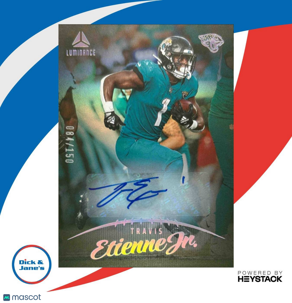 Own a piece of history with this 2023 Panini Luminance Travis Etienne Jr. Autographed trading card! Limited to only 150 copies, this card features a signature from the Jacksonville Jaguars running back himself. Don't miss out on adding this rare find to your collection. Listed With Mascot.