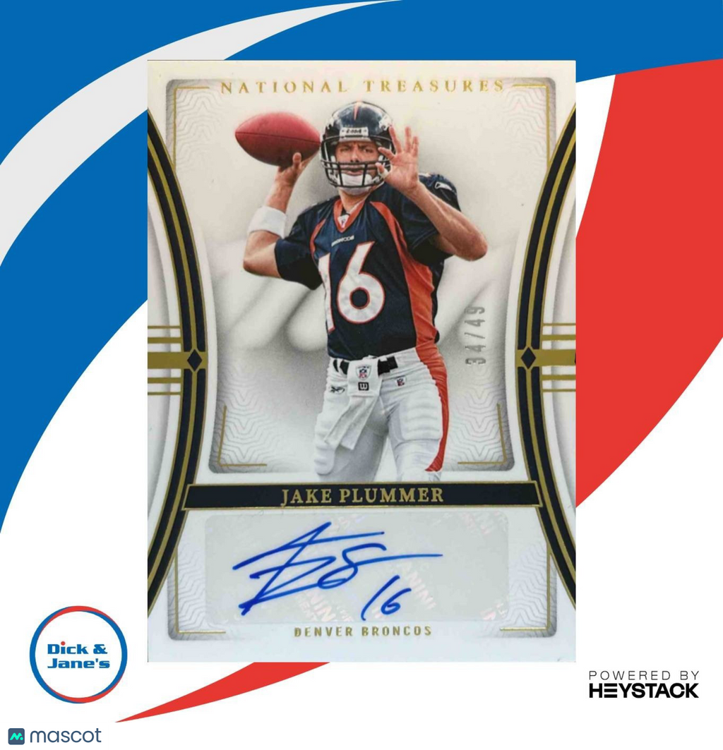 This rare 2023 Panini National Treasures Jake Plummer Signatures Gold trading card is a must-have for any Denver Broncos fan. With a limited edition of 34/49, this card features a genuine autograph from the legendary quarterback. Don't miss out on adding this valuable piece to your collection! Listed With Mascot.