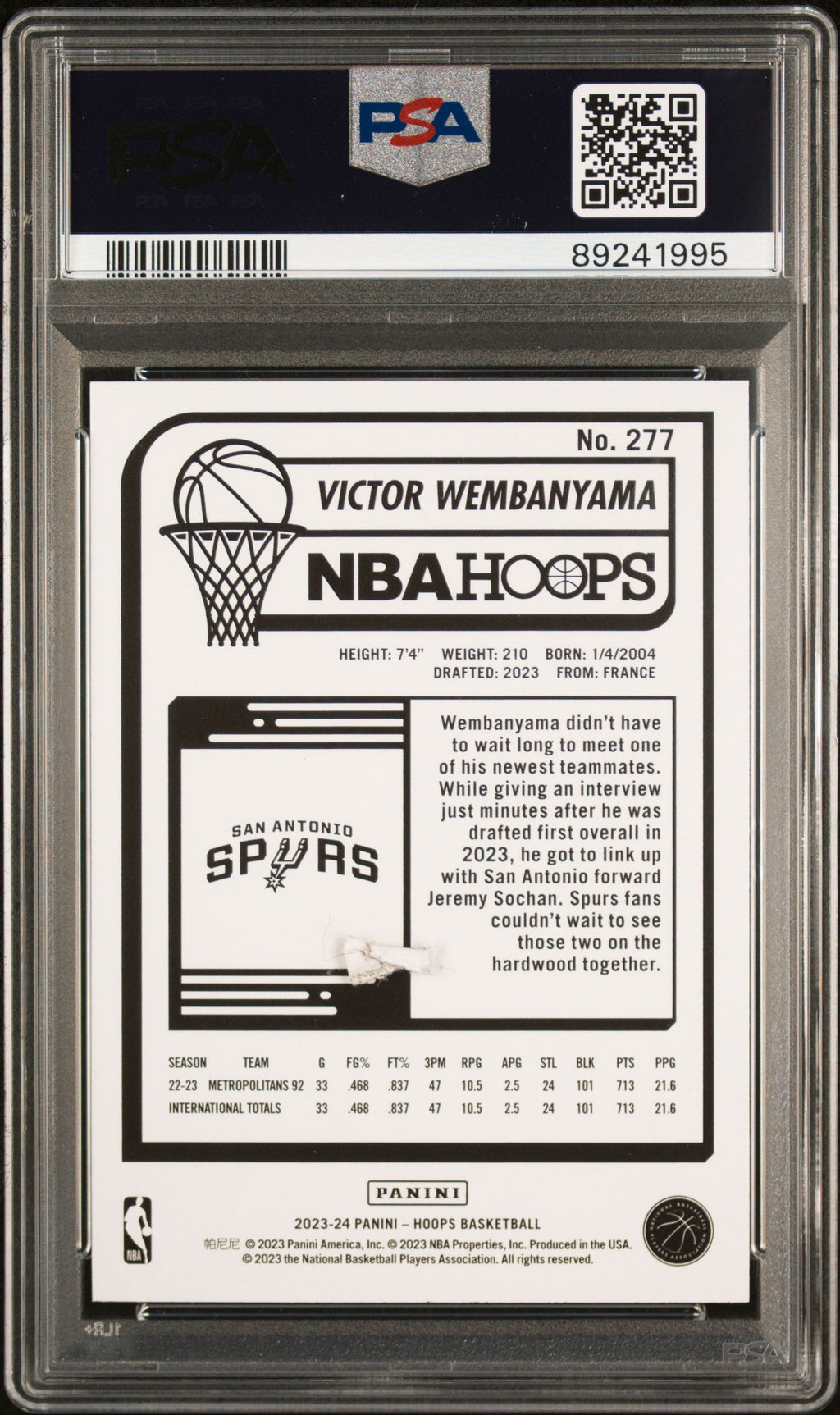 2023 Panini NBA Hoops Victor Wembanyama Rookie #277 PSA 10 GEM MINT San Antonio Spurs Don’t miss your chance to own this highly sought-after 2023 Panini NBA Hoops Victor Wembanyama Rookie card, graded PSA 10 GEM MINT! As one of the most talked-about rookies in recent years, Wembanyama’s cards are heating up the market, and this pristine example is a must-have for any serious basketball or Spurs collector. With zero cards graded higher and a population of just 11,071, this card stands out as a true gem from the latest NBA rookie class. Secure this investment-grade collectible today—perfect for display or as a cornerstone in your collection. This card comes authenticated by Professional Sports Authenticator (PSA) with certification number 89241995, ensuring its authenticity and top-tier condition. Act fast—Wembanyama’s star is only rising, and opportunities like this don’t last long! Set: 2023 Panini NBA Hoops Certification Number: 89241995 Grader: Professional Sports Authenticator (PSA) Grade: 10 Year Manufactured: 2023 Player/Athlete: Victor Wembanyama Graded: Yes Population Higher: 0 Sport: Basketball Manufacturer: Panini Population: 11071 Features: Rookie Team: San Antonio Spurs Card Number: 277 Listed With Mascot.