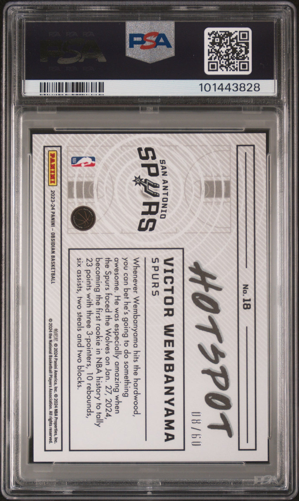 2023 Panini Obsidian Hotspot Victor Wembanyama Reggae Flood /60 #18 PSA 10 Spurs Don’t miss your chance to own this stunning 2023 Panini Obsidian Hotspot Victor Wembanyama Ee Reggae Flood parallel, serial numbered /60 and graded a perfect PSA 10! With only 14 of these cards graded and none higher, this is a true must-have for any serious basketball or Victor Wembanyama collector. Show off your Spurs pride and secure a rare gem from one of the NBA’s most exciting rising stars. This card features vibrant Reggae Flood coloring and comes with PSA certification (number 101443828), guaranteeing authenticity and top condition. Whether you’re investing or adding to your collection, this limited edition card is a standout piece that’s sure to turn heads. Grab it now before it’s gone! Set: 2023 Panini Obsidian Hotspot Certification Number: 101443828 Grader: Professional Sports Authenticator (PSA) Grade: 10 Year Manufactured: 2023 Player/Athlete: Victor Wembanyama Serial Number: /60 Graded: Yes Population Higher: 0 Sport: Basketball Parallel/Variety: Ee Reggae Flood Manufacturer: Panini Population: 14 Features: Serial Numbered Team: San Antonio Spurs Card Number: 18 Listed With Mascot.