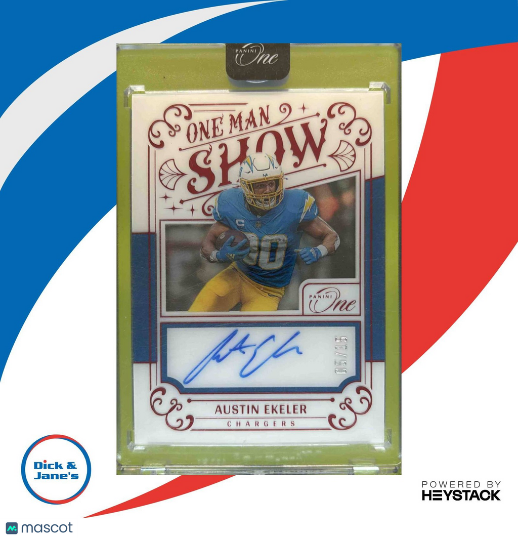 The 2023 Panini One Austin Ekeler 2022 Man Show Red 5/15 #164 Auto Chargers trading card features a rare autograph from the NFL player. Limited to only 15 copies, this card is a must-have for any football card collector. Don't miss your chance to own a piece of sports history! Listed With Mascot.