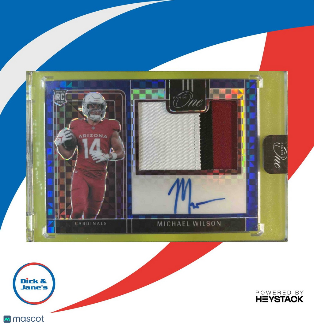 Collect a piece of NFL history with this rare 2023 Panini One Michael Wilson trading card featuring a Precision Rookie Patch Autograph and Rated Prospect Autograph. Limited to just 75 copies with a beautiful blue design, this Arizona Cardinals RC Auto is a must-have for any sports card collector. Listed With Mascot.