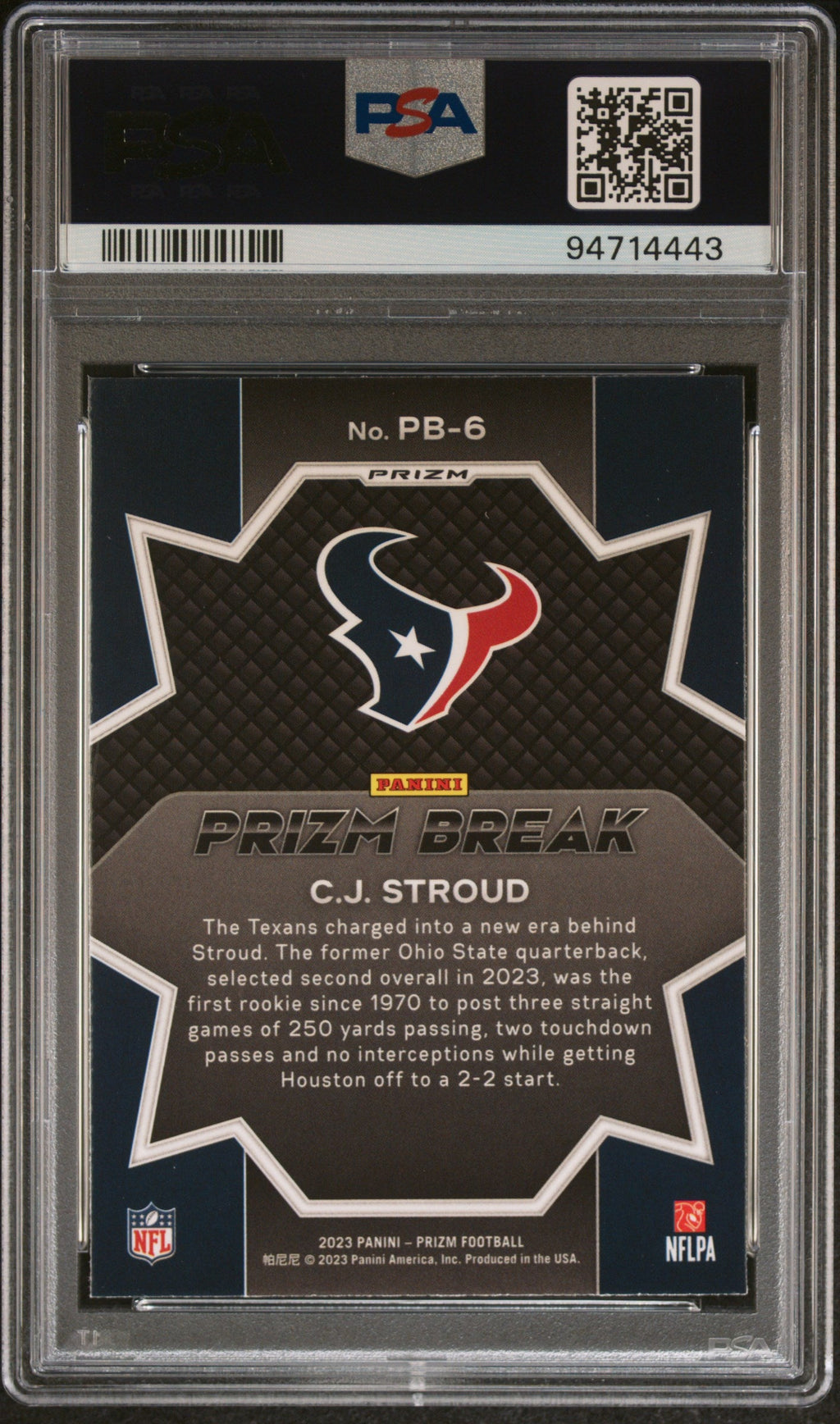 You are purchasing the following: 2023 Panini Prizm Prizm Break CJ Stroud Green #PB6 PSA 10 . You will receive the exact item in the photographs. Note: Please do not connact us and asking the following: 1. What is the lowest you would take? Just make an offer. If the offer is automatically declined, you have your answer. 2. What the best you can do? See above. Not repling to an email is a reply. 3. Any room on this? See above. Not repling to an offer is a reply. 4. We ONLY do one counter offer, so please make your best offer the first time! Note: If the price off, in your option, please send your resaoning and an offer. We will review it. Note: We manage nearly 10 millon cards regularly and will adjust prices as errors are noticed or pointed out! Listed With Mascot.