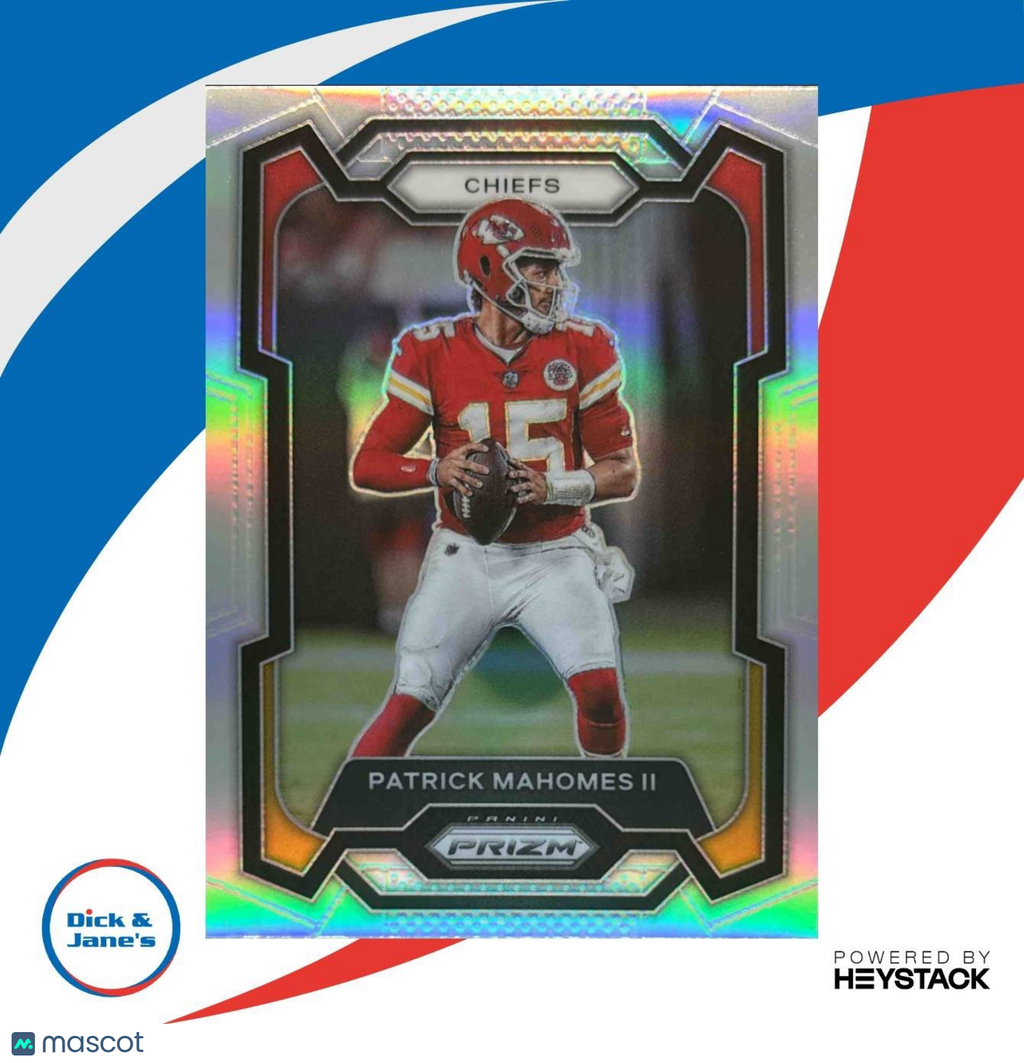 Capture the excitement of the game with this 2023 Panini Prizm Patrick Mahomes II Silver #149 trading card featuring the star quarterback of the Kansas City Chiefs. This rare silver variant is a must-have for any collector or Chiefs fan. Don't miss your chance to own a piece of NFL history! Listed With Mascot.