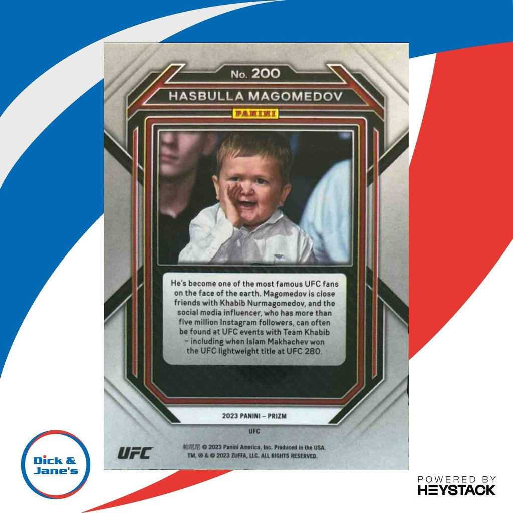 This 2023 Panini Prizm UFC trading card features the rookie card of internet sensation Hasbulla Magomedov. A rare and highly sought-after collectible, this card showcases Hasbulla in action in vibrant detail. Don't miss your chance to add this unique piece to your collection! Listed With Mascot.