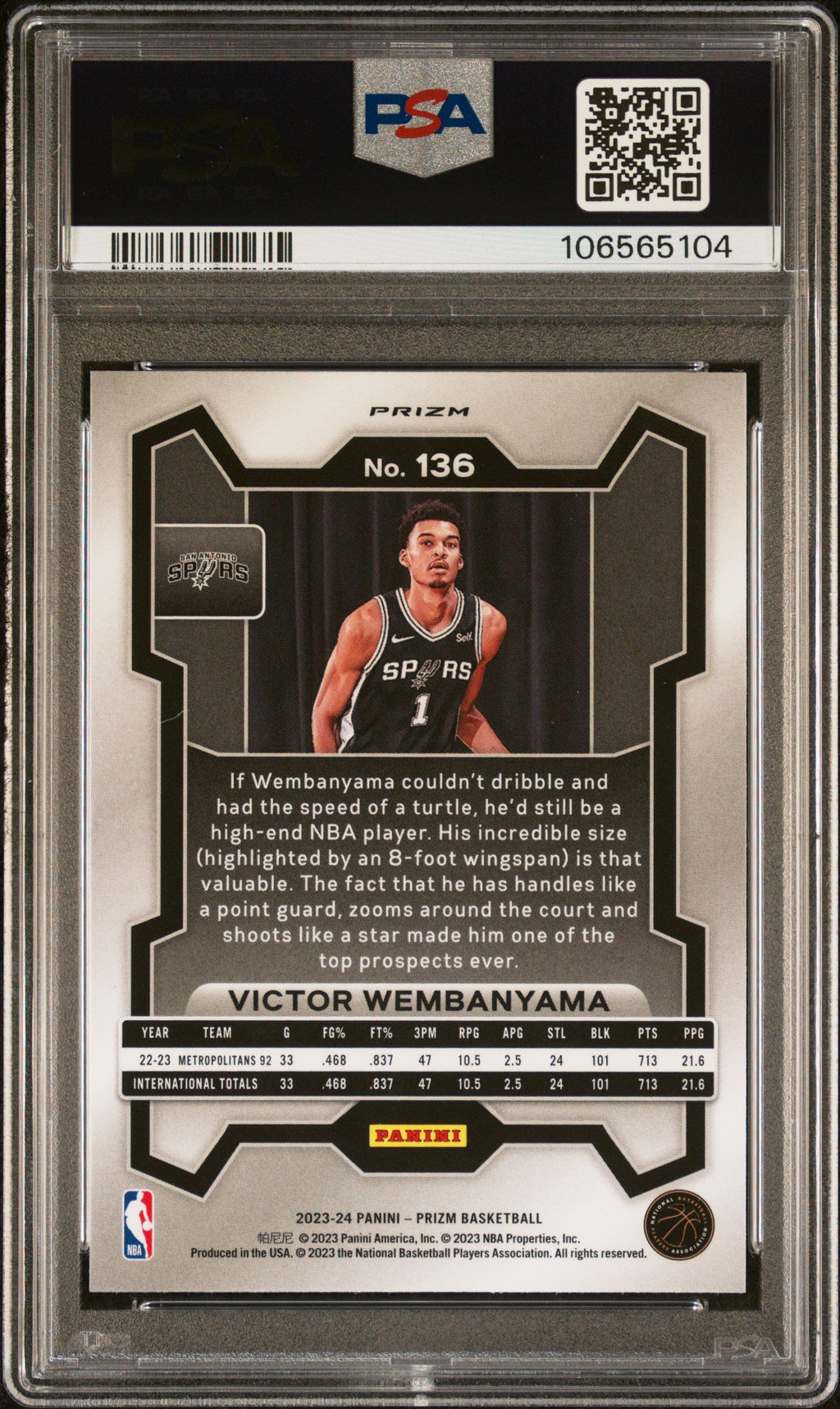2023 Panini Prizm Victor Wembanyama Orange Ice Rookie #136 PSA 9 MINT San Antonio Spurs Don't miss your chance to own this hot 2023 Panini Prizm Victor Wembanyama Orange Ice Rookie card, graded PSA 9 MINT! With Wembanyama's star rising fast in the NBA and his rookie cards in high demand, this Orange Ice parallel is a standout addition for any serious collector or Spurs fan. Professionally graded by PSA with certification number 106565104, this card is ready to be the centerpiece of your basketball collection. This rare rookie features the highly coveted Orange Ice design and boasts a low population of just 753, with only 1120 graded higher. Secure this investment piece today and celebrate the beginning of Wembanyama's exciting career with the San Antonio Spurs! Set: 2023 Panini Prizm Certification Number: 106565104 Grader: Professional Sports Authenticator (PSA) Year Manufactured: 2023 Player/Athlete: Victor Wembanyama Grade: 9 Graded: Yes Population Higher: 1120 Sport: Basketball Parallel/Variety: Orange Ice Manufacturer: Panini Population: 753 Features: Rookie Team: San Antonio Spurs Card Number: 136 Listed With Mascot.