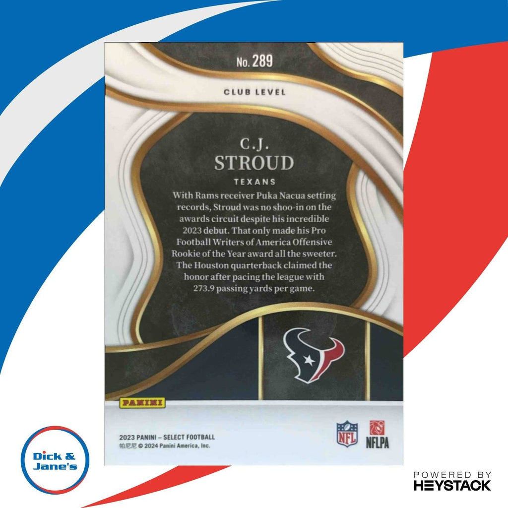 Own a piece of NFL history with this 2023 Panini Select C.J. Stroud #289 Club RC Houston Texans trading card. Highly sought after rookie card featuring the up-and-coming star quarterback. Perfect for collectors and fans alike. Get yours now before it's gone! Listed With Mascot.