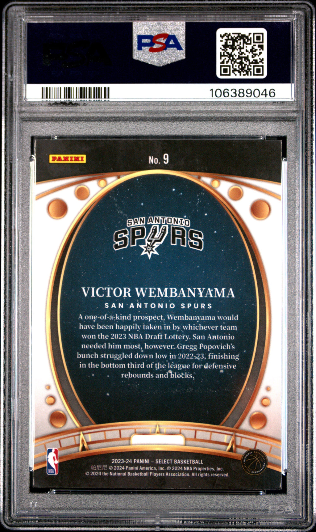2023 Panini Select Lodestars Victor Wembanyama Rookie #9 PSA 10 San Antonio Spurs Up for grabs is a must-have for collectors and NBA fans alike—a 2023 Panini Select Lodestars Victor Wembanyama Rookie #9, graded a perfect PSA 10! This highly sought-after rookie card features the rising superstar of the San Antonio Spurs, making it an instant centerpiece for any basketball card collection. With a population of only 591 and none graded higher, this card is a rare find that’s sure to skyrocket in value as Wembanyama’s career continues to take off. This authenticated gem comes with PSA certification number 106389046, ensuring authenticity and top condition. Don’t miss your chance to own a piece of basketball history—secure this Victor Wembanyama rookie card today before it’s gone! Set: 2023 Panini Select Lodestars Certification Number: 106389046 Grader: Professional Sports Authenticator (PSA) Grade: 10 Year Manufactured: 2023 Player/Athlete: Victor Wembanyama Graded: Yes Population Higher: 0 Sport: Basketball Manufacturer: Panini Population: 591 Features: Rookie Team: San Antonio Spurs Card Number: 9 Listed With Mascot.
