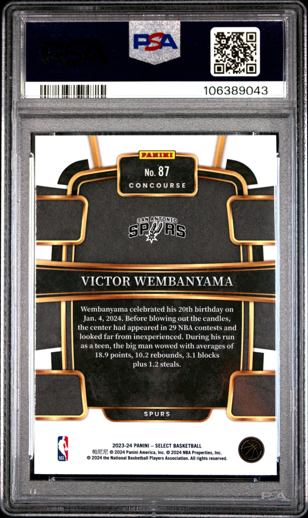 2023 Panini Select Victor Wembanyama Blue Rookie #87 PSA 8 San Antonio Spurs Don't miss your chance to own this highly sought-after 2023 Panini Select Victor Wembanyama Blue Rookie card, graded PSA 8! This card features the rising superstar of the San Antonio Spurs and is a must-have for basketball collectors and Wembanyama fans. With its eye-catching Blue parallel and official rookie status, this card stands out in any collection. Professionally graded and authenticated by PSA, this card comes with certification number 106389043 and is one of only 359 in the population, with just 17,428 graded higher. Secure this rare piece of NBA history today and add a true gem to your sports memorabilia lineup! Set: 2023 Panini Select Certification Number: 106389043 Grader: Professional Sports Authenticator (PSA) Year Manufactured: 2023 Player/Athlete: Victor Wembanyama Grade: 8 Graded: Yes Population Higher: 17428 Sport: Basketball Parallel/Variety: Blue Manufacturer: Panini Population: 359 Features: Rookie Team: San Antonio Spurs Card Number: 87 Listed With Mascot.