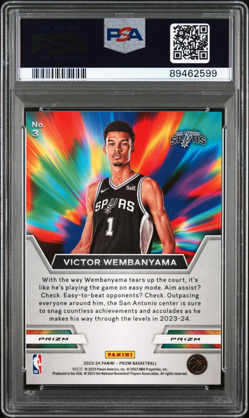 2023 Panini Prizm Instant Impact Victor Wembanyama Green Rookie #3 PSA 8 San Antonio Spurs Don’t miss your chance to own this highly sought-after 2023 Panini Prizm Instant Impact Green Rookie card featuring Victor Wembanyama of the San Antonio Spurs! Professionally graded PSA 8 and boasting a super low population of just 27, this card stands out as a fantastic addition for any basketball card collector or Spurs fan. With only 751 cards graded higher, this rare parallel is a must-have investment for those chasing the hottest rookie of the year. This card features the eye-catching Green parallel and is officially authenticated by Professional Sports Authenticator (PSA) with certification number 89462599. Secure this gem for your collection and celebrate the excitement of Wembanyama’s rookie season! Set: 2023 Panini Prizm Instant Impact Certification Number: 89462599 Grader: Professional Sports Authenticator (PSA) Year Manufactured: 2023 Player/Athlete: Victor Wembanyama Grade: 8 Graded: Yes Population Higher: 751 Sport: Basketball Parallel/Variety: Green Manufacturer: Panini Population: 27 Features: Rookie Team: San Antonio Spurs Card Number: 3 Listed With Mascot.