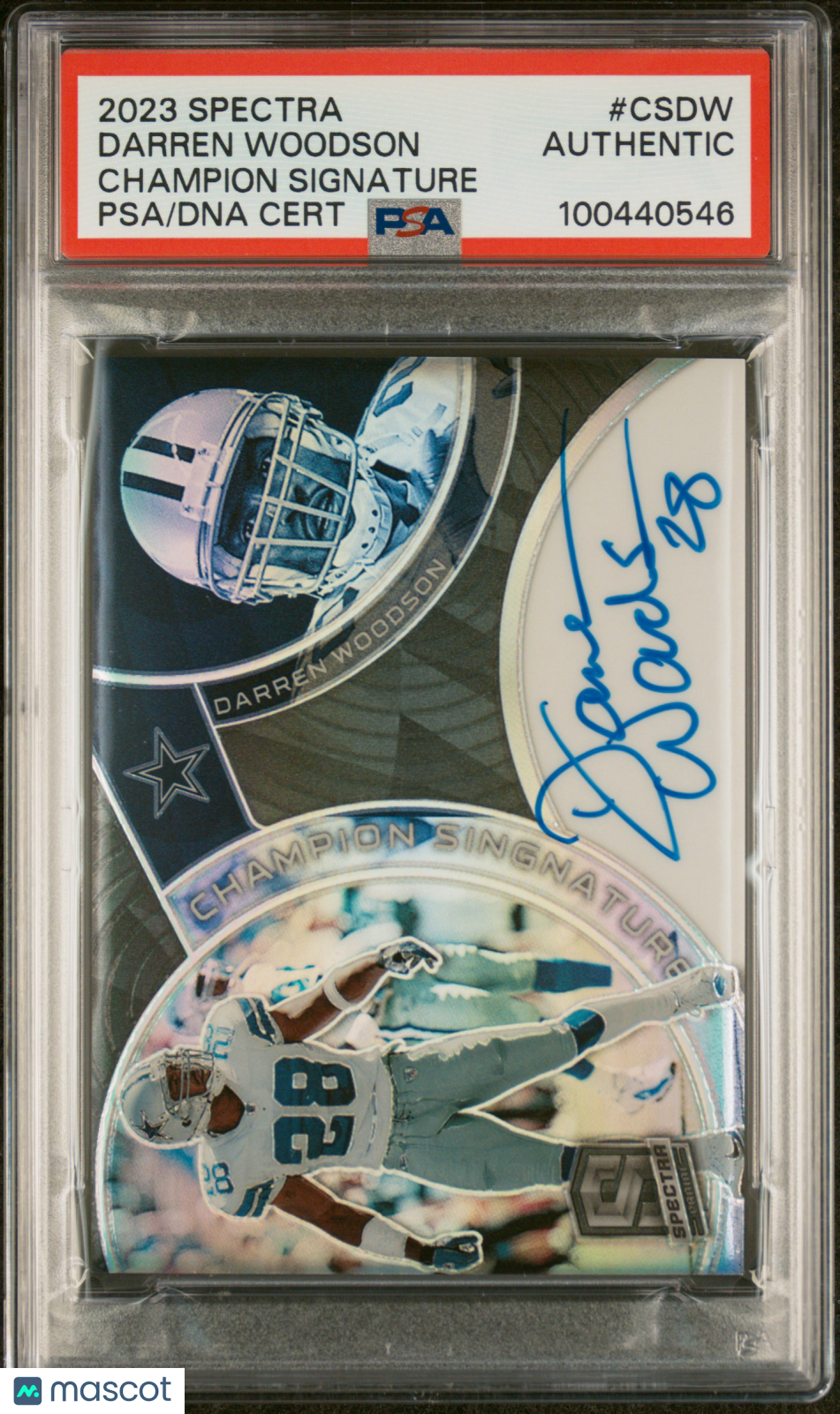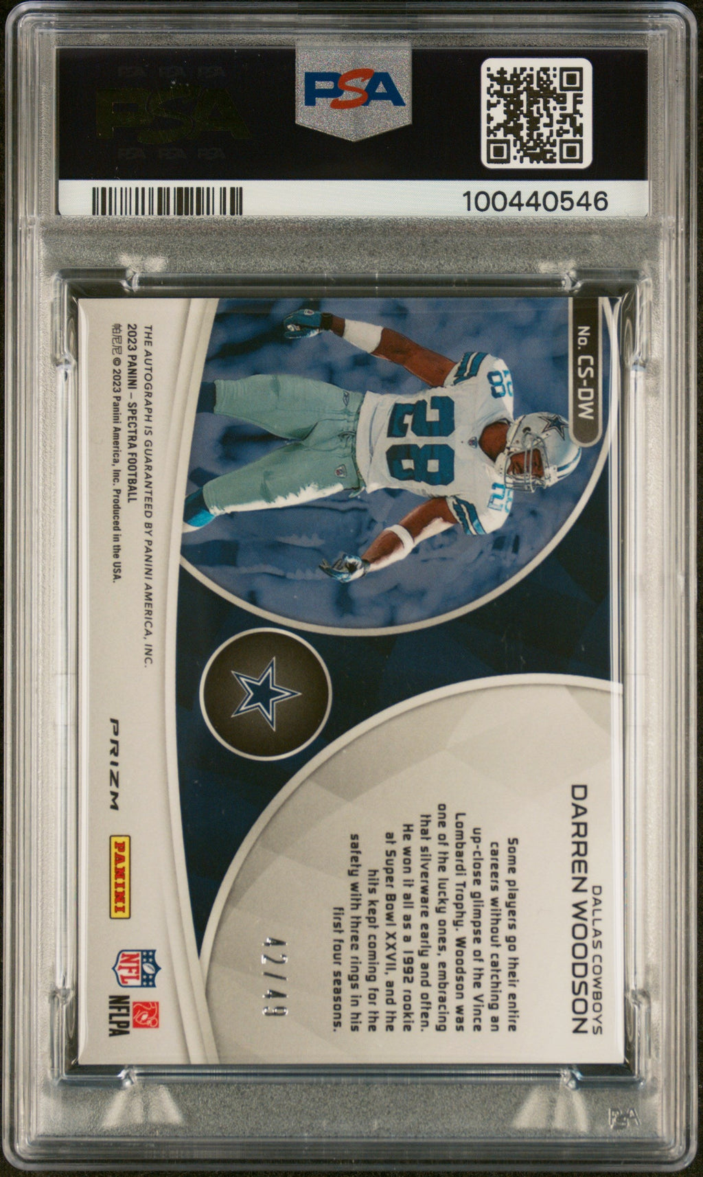 You are purchasing the following: 2023 Panini Spectra Champion Signatures Darren Woodson On Card Auto Dallas Cowboys PSA Authentic #CSDW PSA A . You will receive the exact item in the photographs. Note: Please do not connact us and asking the following: 1. What is the lowest you would take? Just make an offer. If the offer is automatically declined, you have your answer. 2. What the best you can do? See above. Not repling to an email is a reply. 3. Any room on this? See above. Not repling to an offer is a reply. 4. We ONLY do one counter offer, so please make your best offer the first time! Note: If the price off, in your option, please send your resaoning and an offer. We will review it. Note: We manage nearly 10 millon cards regularly and will adjust prices as errors are noticed or pointed out! Listed With Mascot.