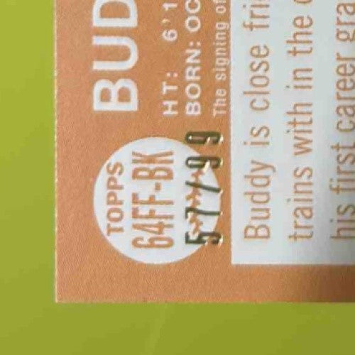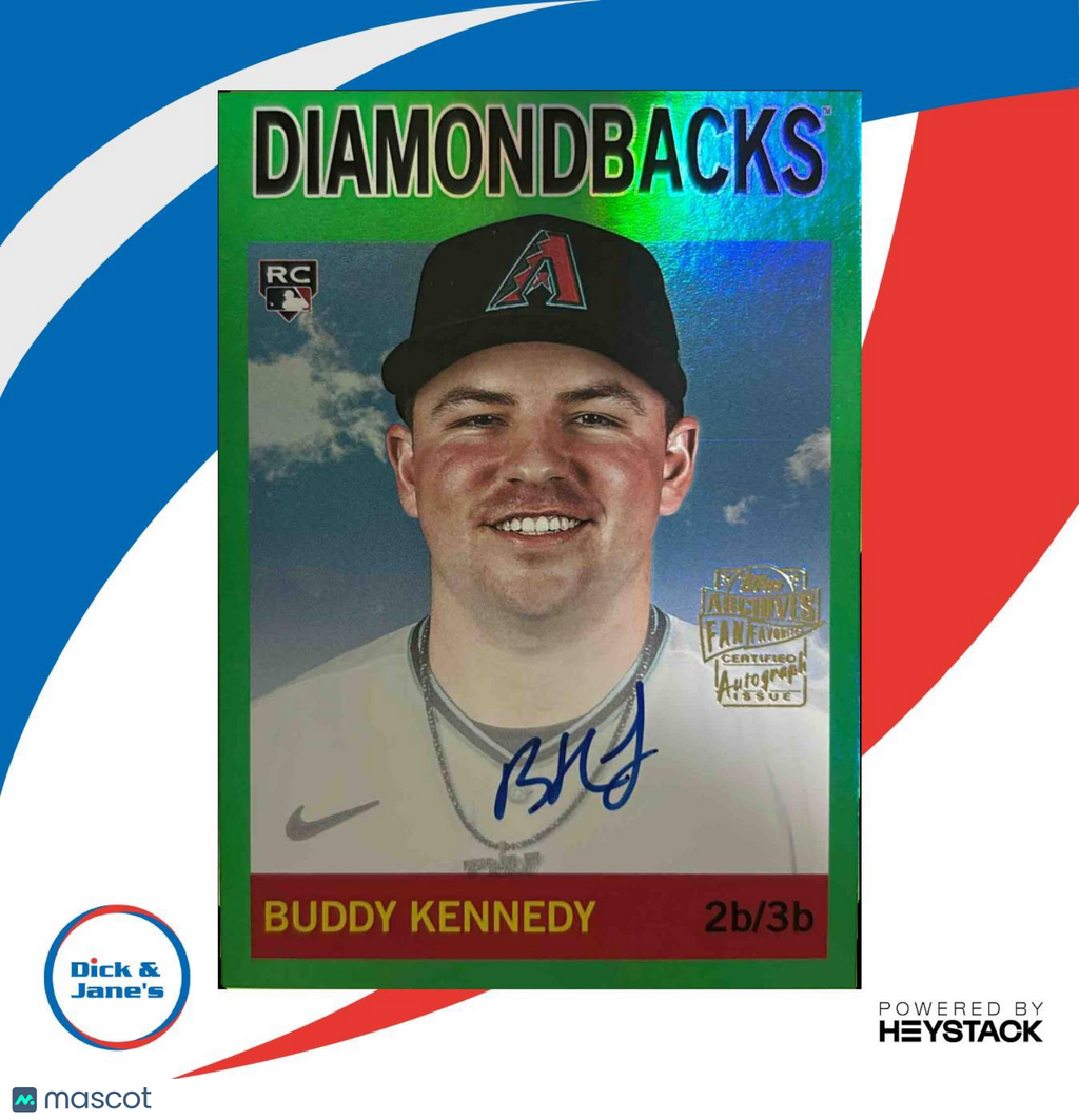 Check out this rare 2023 Topps Archives Buddy Kennedy Fan Favorites Auto Green Foil card! Limited to only 57/99, this MLB Rookie Card features Kennedy's authentic autograph. A must-have for any Arizona baseball fan or trading card collector. Grab it before it's gone! Listed With Mascot.