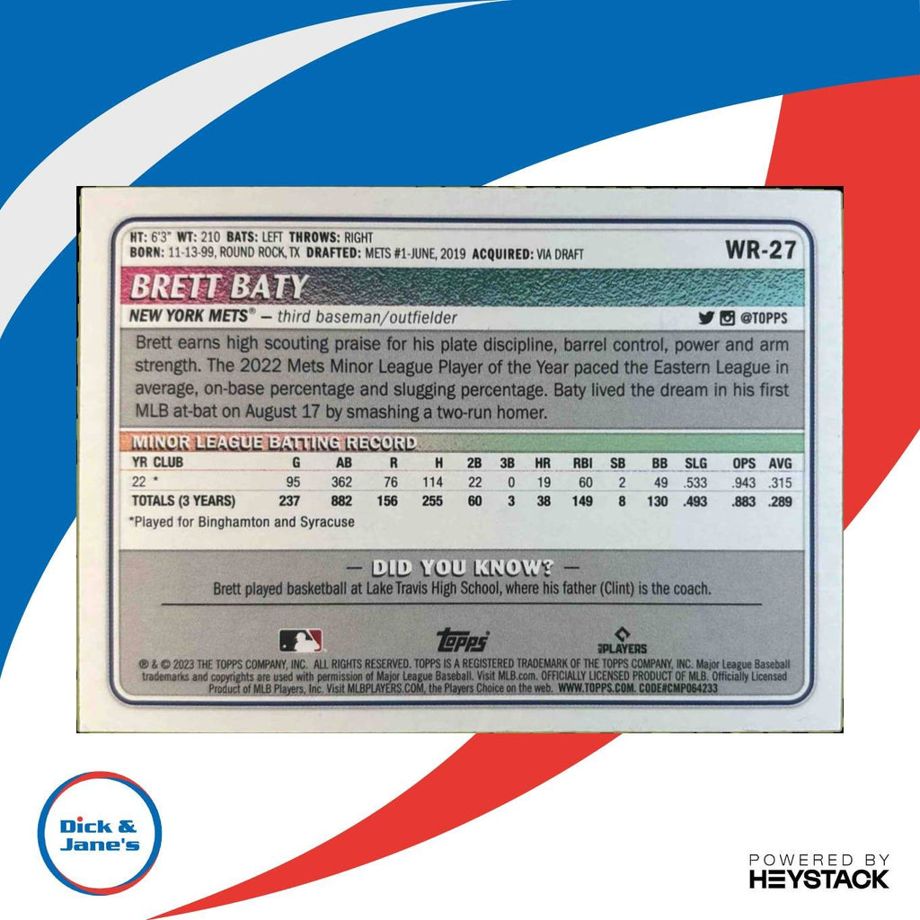 2023 Topps Big League Wrapper Redemption Brett Baty Green Foil 18/99 #WR-27 Mets Listed With Mascot.