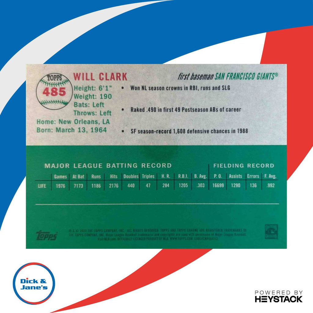 2023 Topps Chrome Platinum Anniversary Will Clark Blue Shimmer /100 #485 Giants Listed With Mascot.