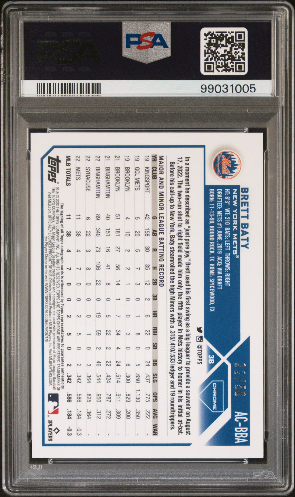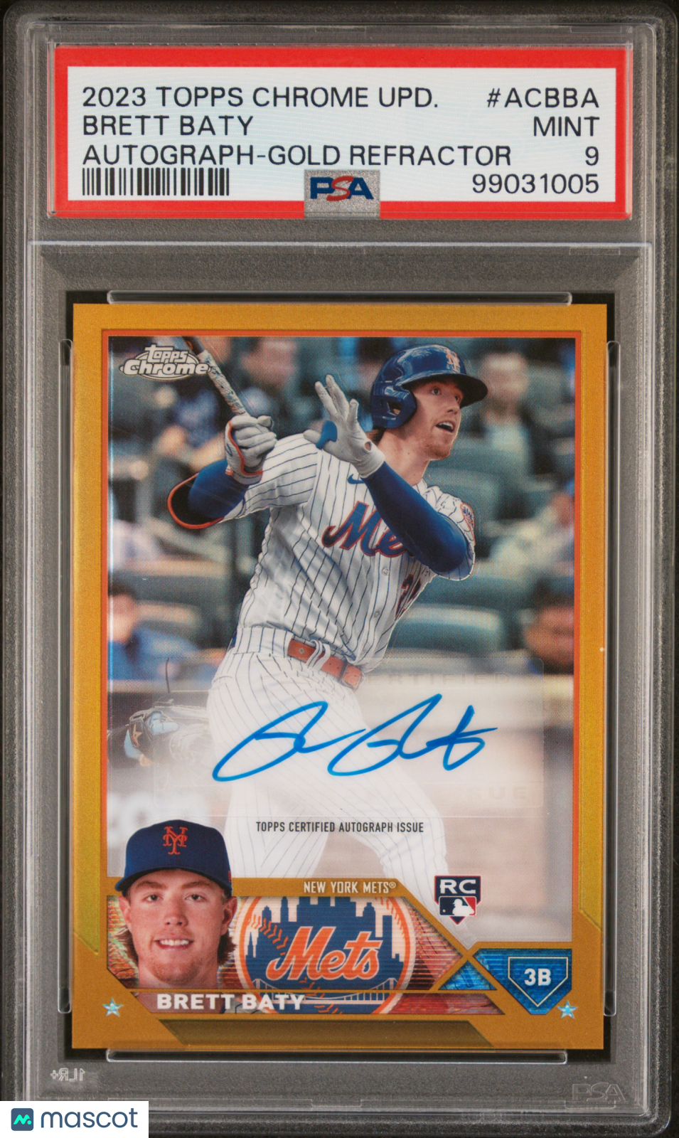 You are purchasing the following: 2023 Topps Chrome Update Autograph Brett Baty Gold Refractor #ACBBA PSA 9 . You will receive the exact item in the photographs. Note: Please do not connact us and asking the following: 1. What is the lowest you would take? Just make an offer. If the offer is automatically declined, you have your answer. 2. What the best you can do? See above. Not repling to an email is a reply. 3. Any room on this? See above. Not repling to an offer is a reply. 4. We ONLY do one counter offer, so please make your best offer the first time! Note: If the price off, in your option, please send your resaoning and an offer. We will review it. Note: We manage nearly 10 millon cards regularly and will adjust prices as errors are noticed or pointed out! Listed With Mascot.