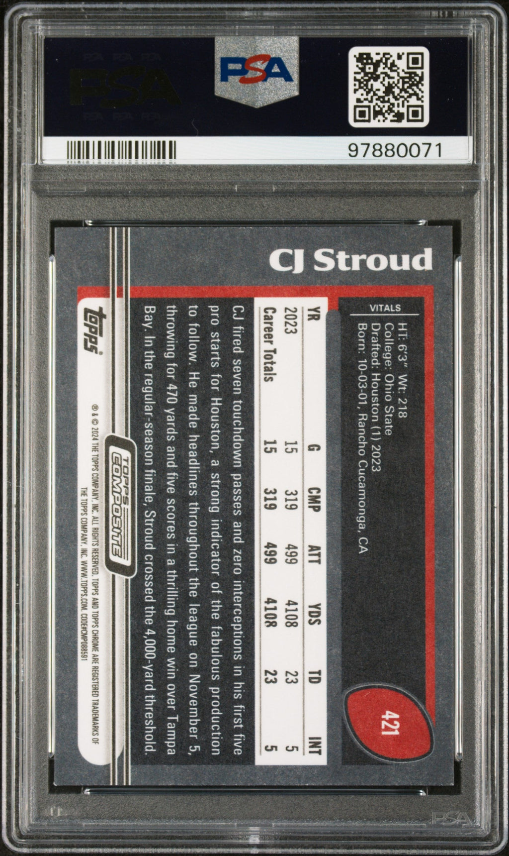 You are purchasing the following: 2023 Topps Composite CJ Stroud #421 PSA 9 . You will receive the exact item in the photographs. Note: Please do not connact us and asking the following: 1. What is the lowest you would take? Just make an offer. If the offer is automatically declined, you have your answer. 2. What the best you can do? See above. Not repling to an email is a reply. 3. Any room on this? See above. Not repling to an offer is a reply. 4. We ONLY do one counter offer, so please make your best offer the first time! Note: If the price off, in your option, please send your resaoning and an offer. We will review it. Note: We manage nearly 10 millon cards regularly and will adjust prices as errors are noticed or pointed out! Listed With Mascot.