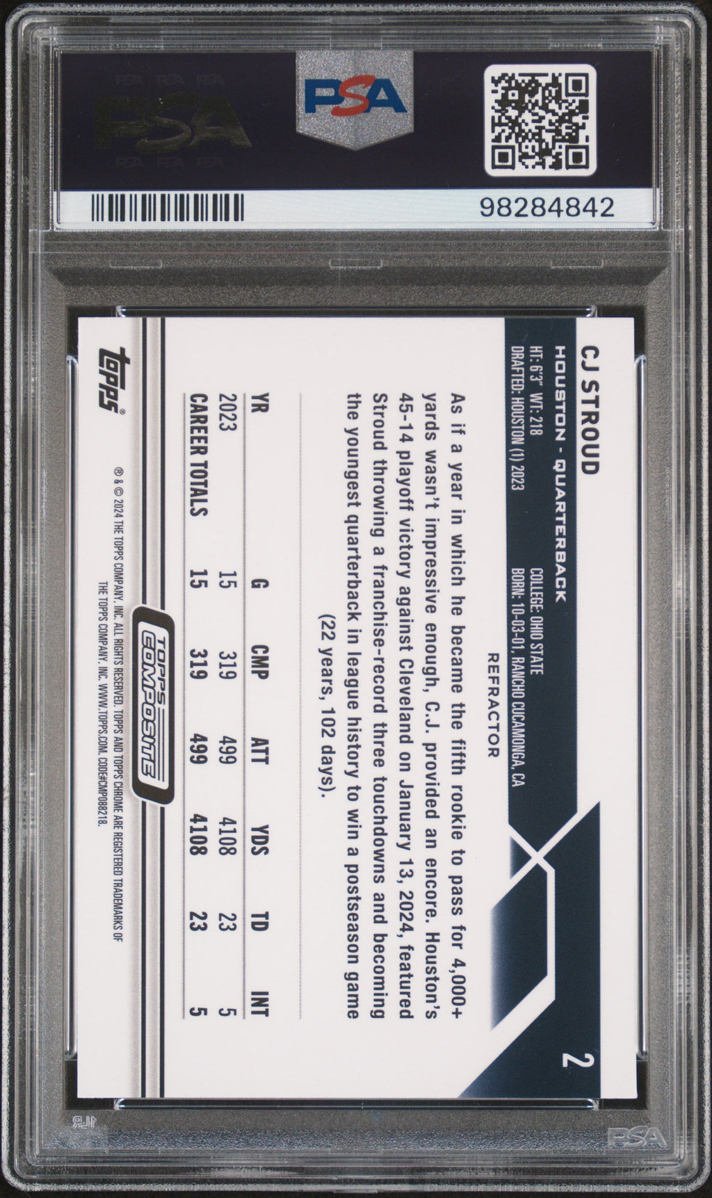 2023 Topps Composite CJ Stroud Refractor Rookie #2 PSA 10 Houston Texans Don’t miss your chance to own this stunning 2023 Topps Composite CJ Stroud Refractor Rookie card, graded a perfect PSA 10! As one of only 84 in existence with none graded higher, this highly sought-after rookie card is a must-have for any serious football card collector or Houston Texans fan. Featuring vibrant refractor shine and the official PSA certification, this card stands out as a true gem in the hobby. This card not only celebrates CJ Stroud’s promising NFL debut but also offers long-term investment potential with its rare rookie status and pristine condition. Secure this limited population card today and add a centerpiece to your collection before it’s gone! Set: 2023 Topps Composite Certification Number: 98284842 Grader: Professional Sports Authenticator (PSA) Grade: 10 Year Manufactured: 2023 Player/Athlete: CJ Stroud Graded: Yes Sport: Football Population Higher: 0 Parallel/Variety: Refractor Manufacturer: Topps Population: 84 Features: Rookie Team: Houston Texans Card Number: 2 Listed With Mascot.