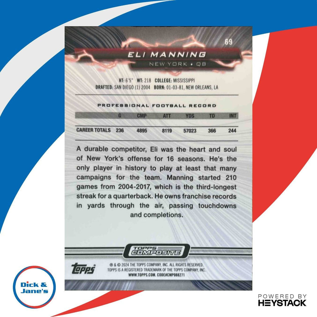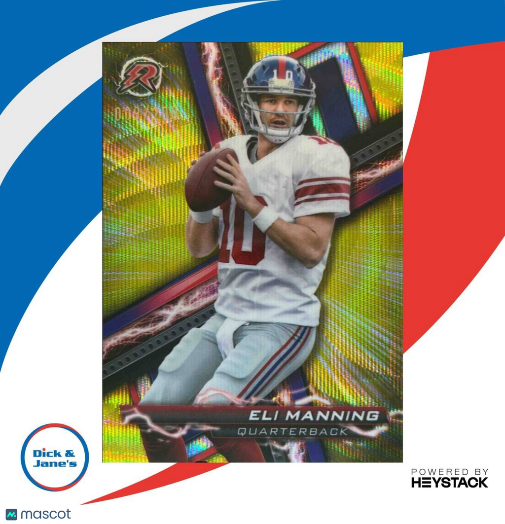 Rare 2023 Topps Composite Eli Manning Resurgence Yellow Surge card, numbered out of /200. Featuring the legendary Giants quarterback in a stunning design. A must-have for any football card collector. Invest in a piece of NFL history today! Listed With Mascot.