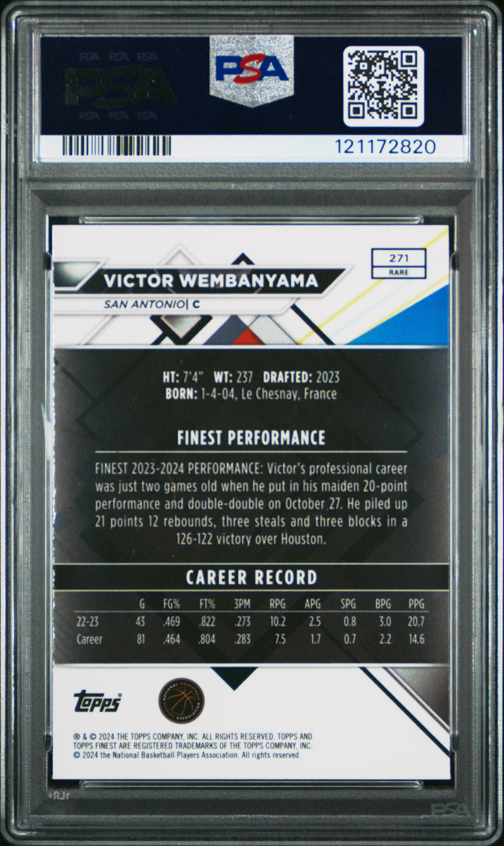 2023 Topps Finest Victor Wembanyama Checkerboard #271 PSA 10 San Antonio Spurs Up for grabs is a stunning 2023 Topps Finest Victor Wembanyama Checkerboard parallel, card #271, professionally graded a perfect PSA 10! With only 40 cards in the population and none graded higher, this is a true gem for any basketball or Spurs fan looking to add a major rookie card to their collection. Wembanyama’s cards are red hot, and this rare Checkerboard variety stands out with eye-catching appeal and top-tier condition. Don’t miss your chance to own a piece of basketball history featuring the San Antonio Spurs’ sensational rookie. This card is authenticated by Professional Sports Authenticator (PSA) with certification number 121172820, ensuring quality and value. Secure this investment-grade collectible today and celebrate one of the most exciting young talents in the NBA! Set: 2023 Topps Finest Certification Number: 121172820 Grader: Professional Sports Authenticator (PSA) Grade: 10 Year Manufactured: 2023 Player/Athlete: Victor Wembanyama Graded: Yes Population Higher: 0 Sport: Basketball Parallel/Variety: Checkerboard Manufacturer: Topps Population: 40 Team: San Antonio Spurs Card Number: 271 Listed With Mascot.
