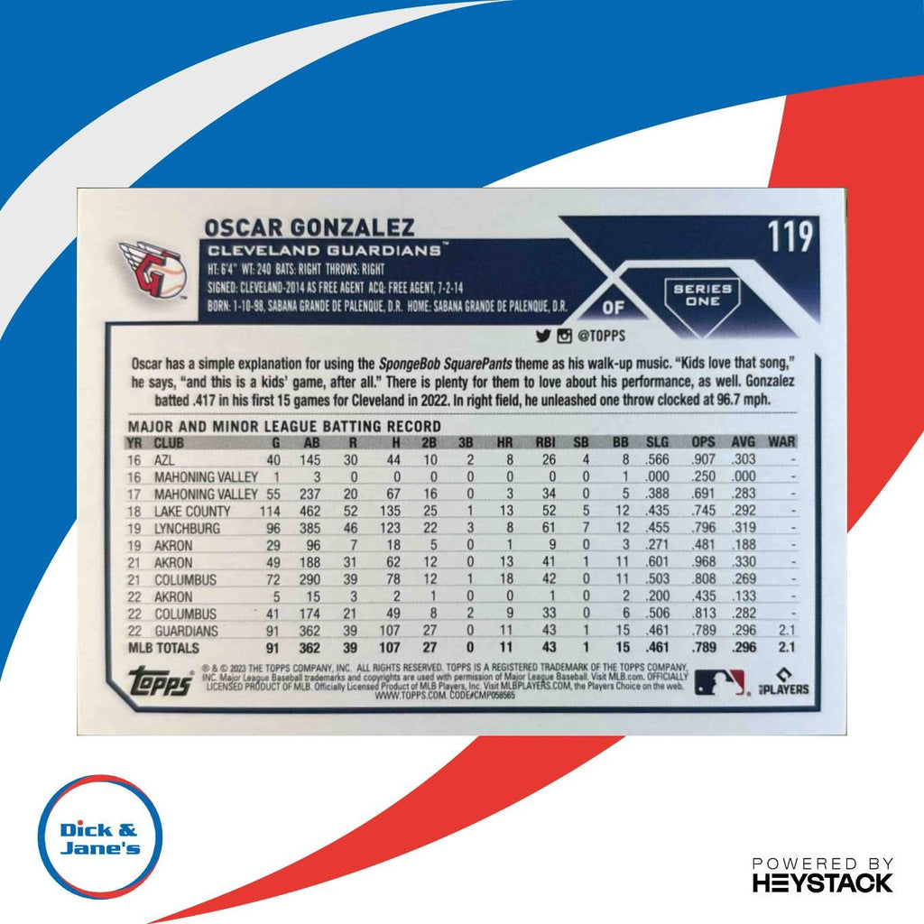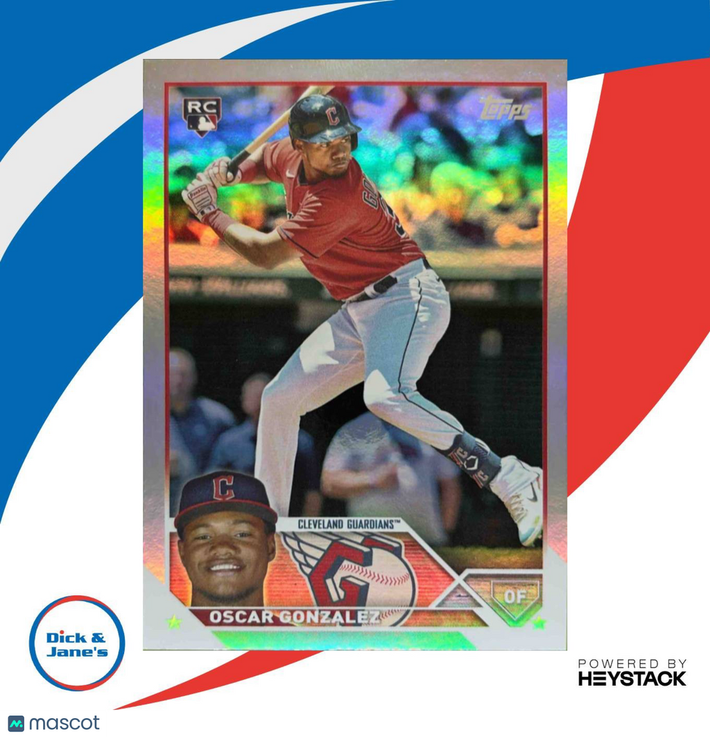 2023 Topps Oscar Gonzalez Rainbow Foil #119 RC Cleveland Guardians Listed With Mascot.