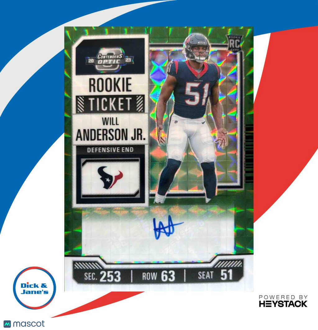 2023 Zenith Will Anderson Jr Contenders Optic Rookie Ticket Preview Green /23 AU Listed With Mascot.