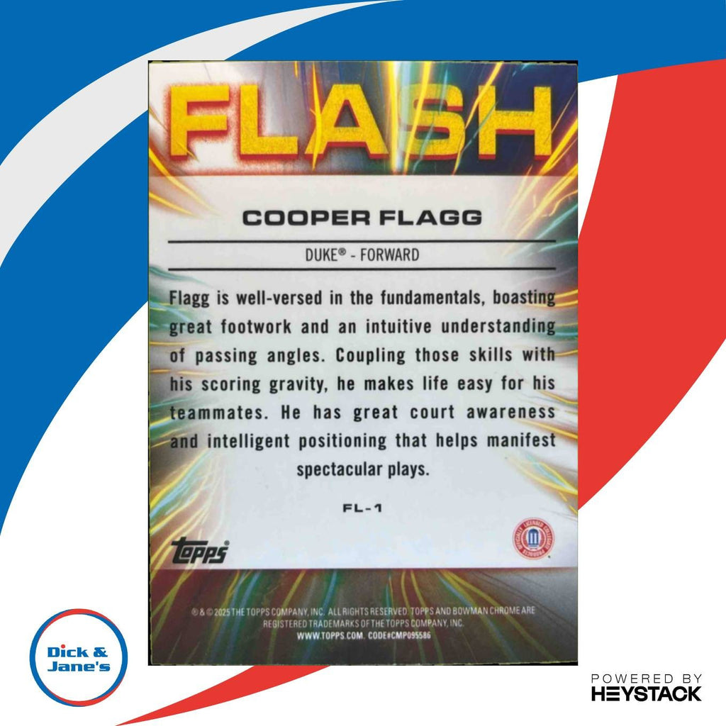This 2024-25 Bowman University Chrome Cooper Flagg Flash X-Fractor FL-1 Duke/Dallas card is a must-have for any sports card collector. Featuring a stunning design, this rare card showcases top prospect Cooper Flagg in his Duke University and Dallas team colors. Don't miss out on adding this unique and valuable card to your collection today! Listed With Mascot.