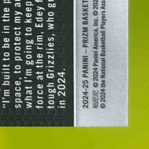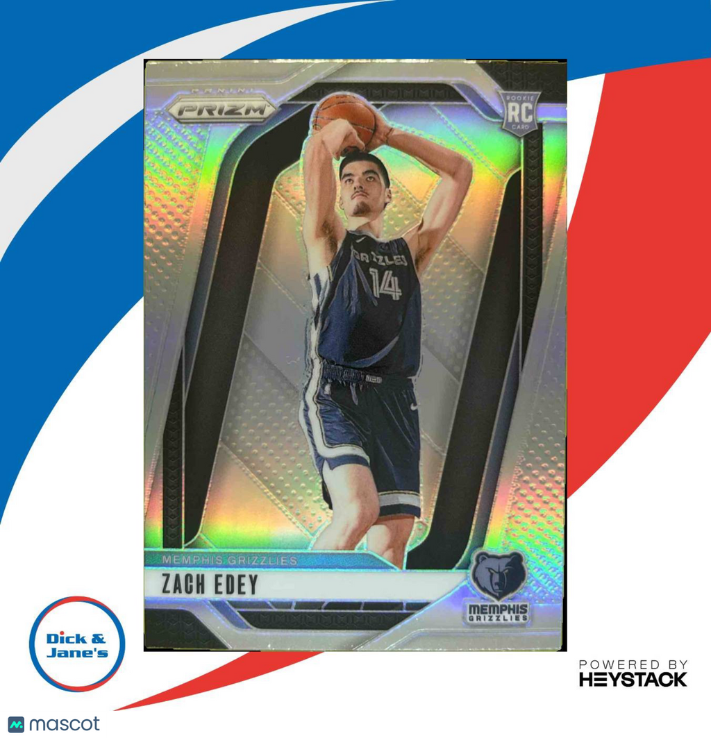 This 2024-25 Panini Prizm Zach Edey Silver #249 RC Memphis Grizzlies Rookie Card is a must-have for any NBA fan or sports memorabilia collector. Showcasing a stunning silver finish and featuring the talented rookie player Zach Edey, this card is sure to be a valuable addition to any collection. Don't miss your chance to own this rare and highly sought-after trading card! Listed With Mascot.