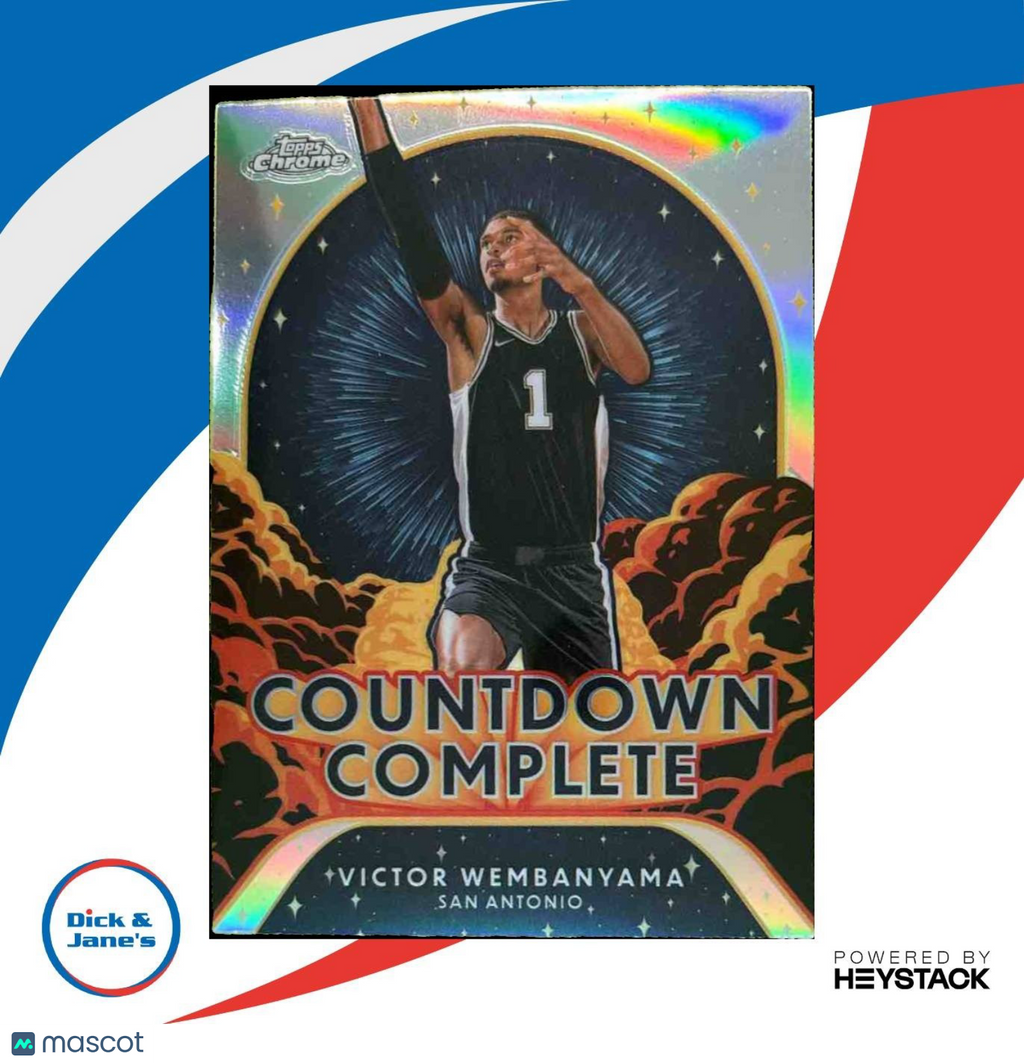 This limited edition NBA trading card features rising star Victor Wembanyama in a sleek chrome design. Complete your collection with this rare Countdown Complete Refractor card from the 2024-25 Topps Chrome series. Don't miss your chance to own a piece of basketball history! Listed With Mascot.