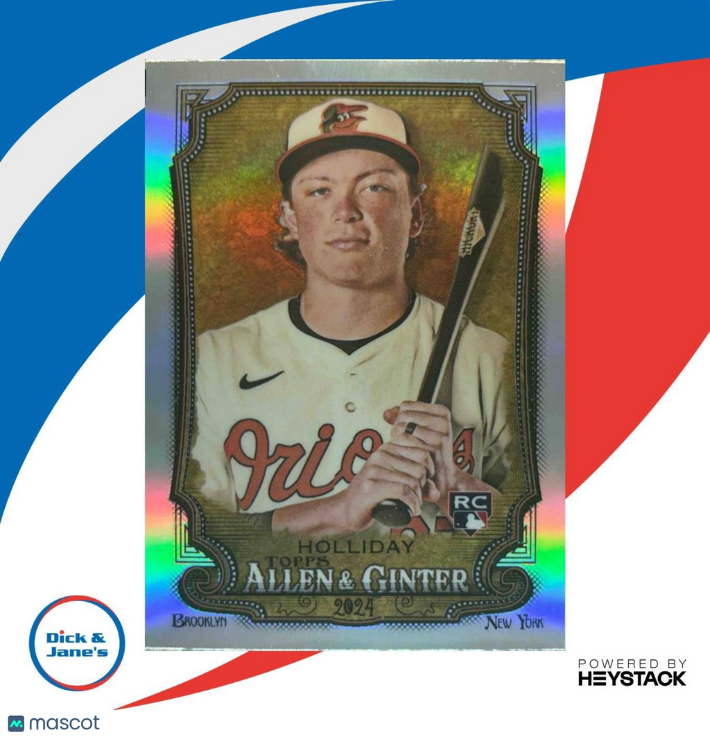 This limited edition 2024 Allen & Ginter Jackson Holliday Chrome Refractor #277 RC Baltimore Orioles trading card is a must-have for any MLB fan. Be the first to own this exclusive rookie card featuring a stunning chrome refractor finish. Add it to your collection today! Listed With Mascot.