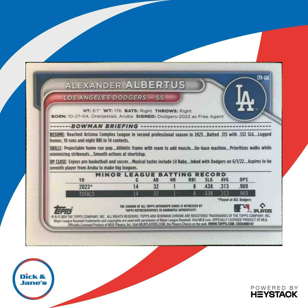 Collect the highly sought-after 2024 Bowman Chrome Alexander Albertus Auto Purple /250 1st Prospect Dodgers trading card. This MLB card features an autograph from rising star Alexander Albertus and is limited to just 250 copies. Don't miss out on this rare and valuable addition to your sports card collection. Listed With Mascot.