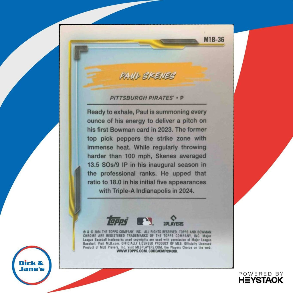 The 2024 Bowman Chrome Paul Skenes My 1st Prospect Mega Box Mojo RC Pirates sports trading card is a must-have for any MLB collector. This rookie card features the rising star Paul Skenes in his first season with the Pittsburgh Pirates. Add this rare and exclusive card to your collection today and watch its value skyrocket as Skenes makes his mark in the league. Don't miss out on owning a piece of baseball history! Listed With Mascot.