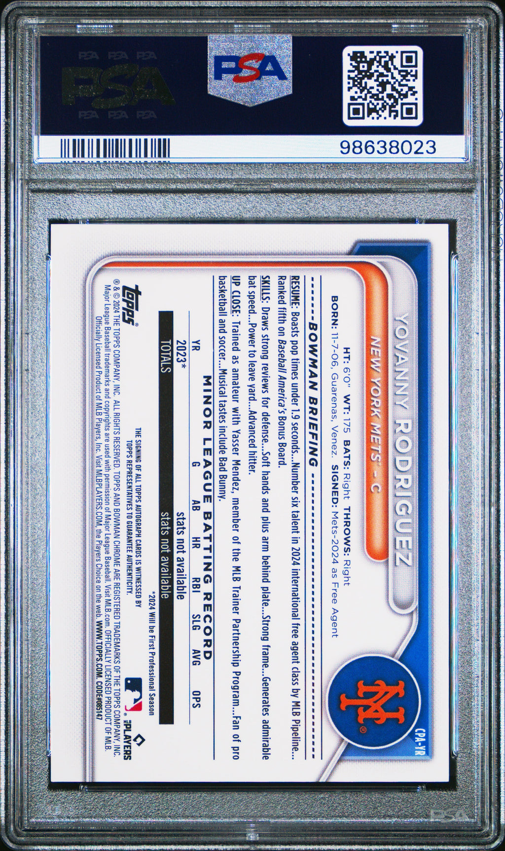 You are purchasing the following: 2024 Bowman Chrome Prospect Autographs Yovanny Rodriguez Yellow Ref 46/75 #CPAYR PSA 9 New York Mets. You will receive the exact item in the photographs. Note: Please do not connact us and asking the following: 1. What is the lowest you would take? Just make an offer. If the offer is automatically declined, you have your answer. 2. What the best you can do? See above. Not repling to an email is a reply. 3. Any room on this? See above. Not repling to an offer is a reply. 4. We ONLY do one counter offer, so please make your best offer the first time! Note: If the price off, in your option, please send your resaoning and an offer. We will review it. Note: We manage nearly 10 millon cards regularly and will adjust prices as errors are noticed or pointed out! Listed With Mascot.