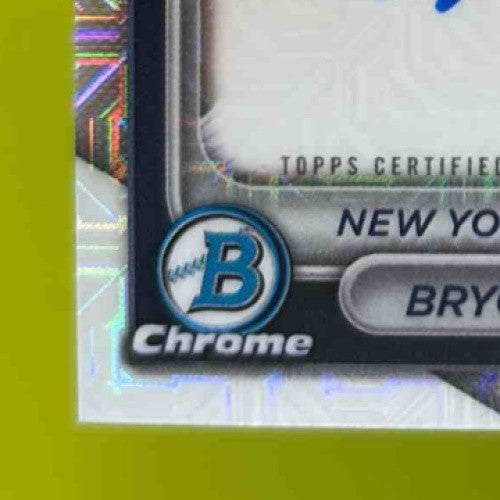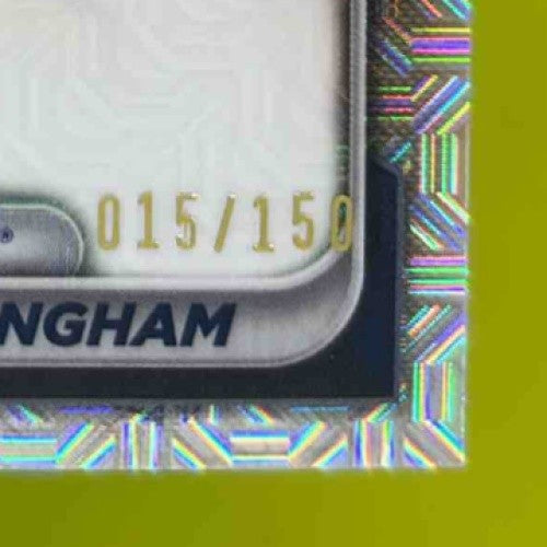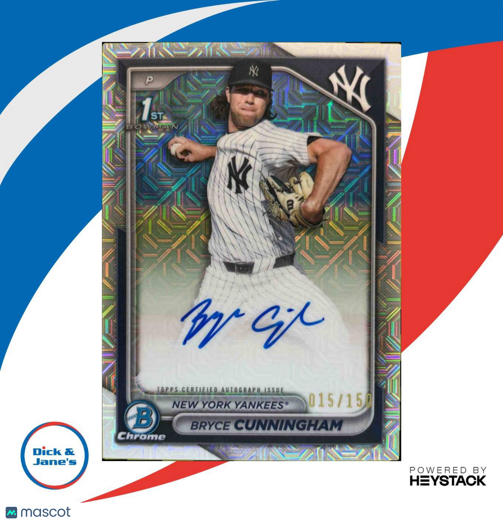 This limited edition 2024 Bryce Cunningham Bowman Draft Chrome Auto MOJO HTA Choice Refractor card is a must-have for any MLB trading card collector. With only 150 produced, this card features Cunningham's first prospect auto signature, making it a valuable addition to any collection. Get your hands on this rare and highly sought-after card today! Listed With Mascot.