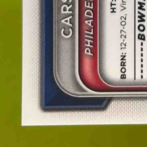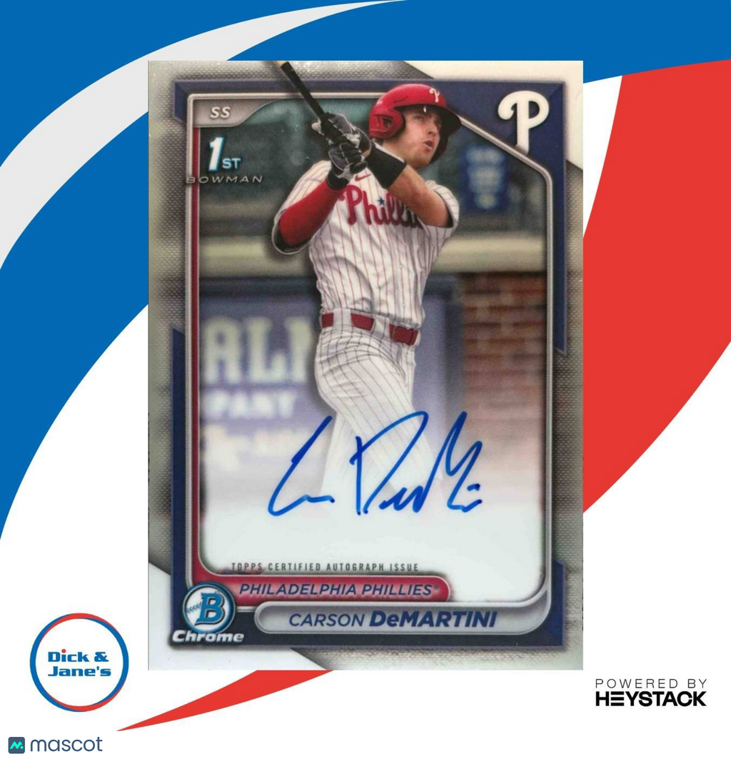 Add this rare and highly sought-after 2024 Bowman Draft Chrome Carson DeMartini Auto 1st Prospect Phillies trading card to your collection today! Featuring an authentic autograph from the first prospect himself, this MLB card is a must-have for any Philadelphia Phillies fan. Don't miss out on owning a piece of baseball history. Listed With Mascot.