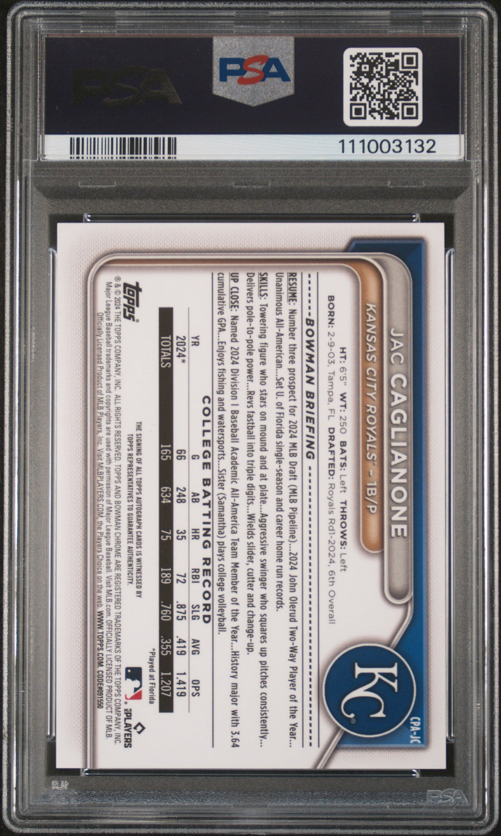 You are purchasing the following: 2024 Bowman Draft Chrome Prospect Autographs Jac Caglianone Aqua Lava 079/199 #CPAJC PSA 8 . You will receive the exact item in the photographs. Note: Please do not connact us and asking the following: 1. What is the lowest you would take? Just make an offer. If the offer is automatically declined, you have your answer. 2. What the best you can do? See above. Not repling to an email is a reply. 3. Any room on this? See above. Not repling to an offer is a reply. 4. We ONLY do one counter offer, so please make your best offer the first time! Note: If the price off, in your option, please send your resaoning and an offer. We will review it. Note: We manage nearly 10 millon cards regularly and will adjust prices as errors are noticed or pointed out! Listed With Mascot.