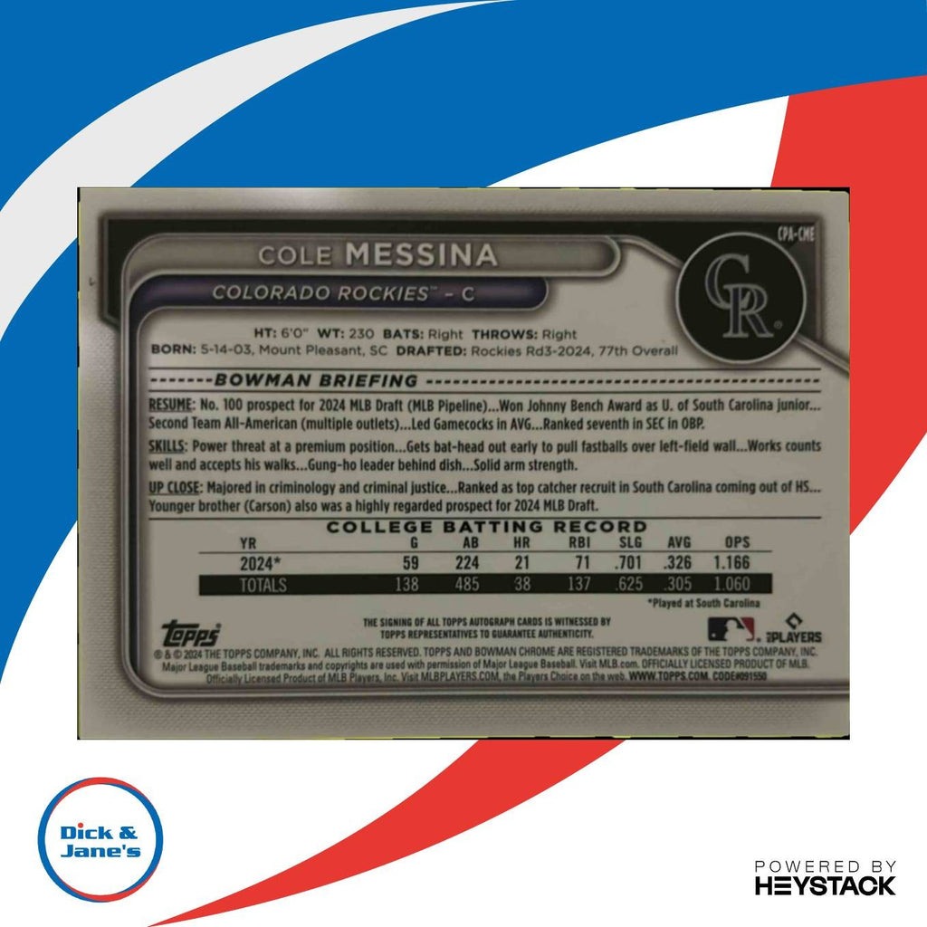 Collect the highly sought after 2024 Bowman Draft Cole Messina Chrome Auto Aqua Lava Refractor trading card. This MLB card features a stunning design and includes a 1st Prospect Auto signature. Limited to only 199 copies, don't miss your chance to own this rare collectible! Listed With Mascot.