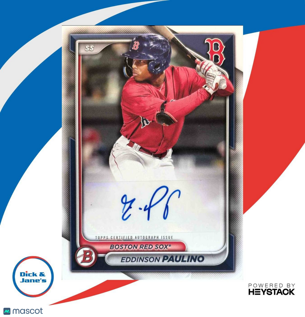 This rare 2024 Bowman Eddinson Paulino Prospect Auto #PPRA-EP trading card features an authentic autograph from the promising Boston Red Sox player. A must-have for any collector or Boston fan looking to add a piece of baseball history to their collection. Don't miss out on this one-of-a-kind MLB card! Listed With Mascot.